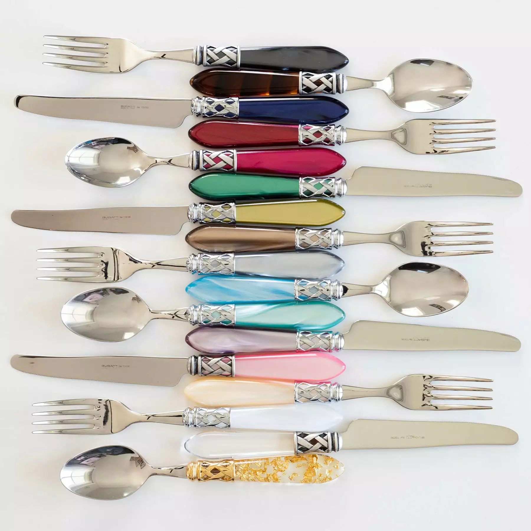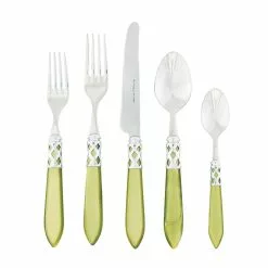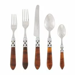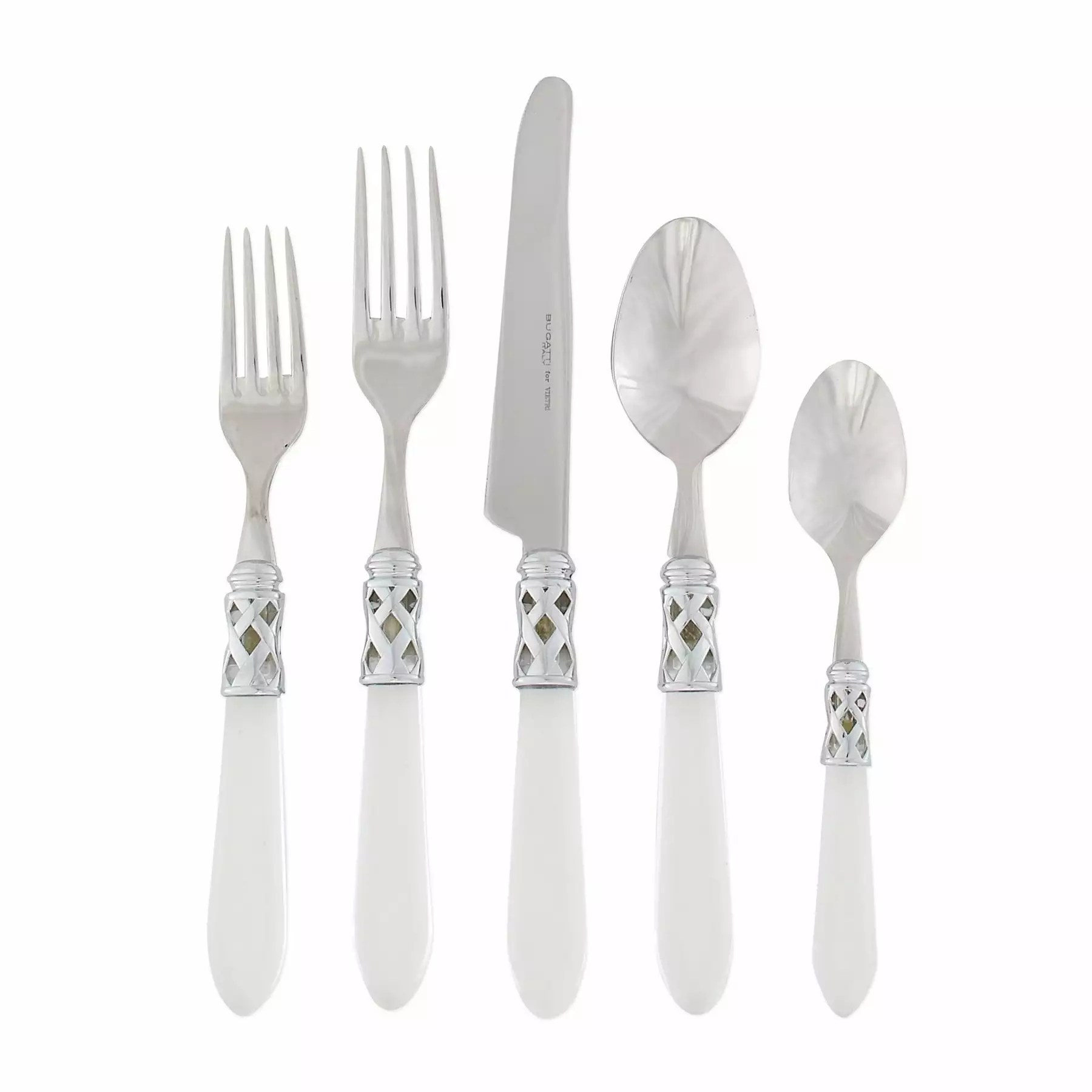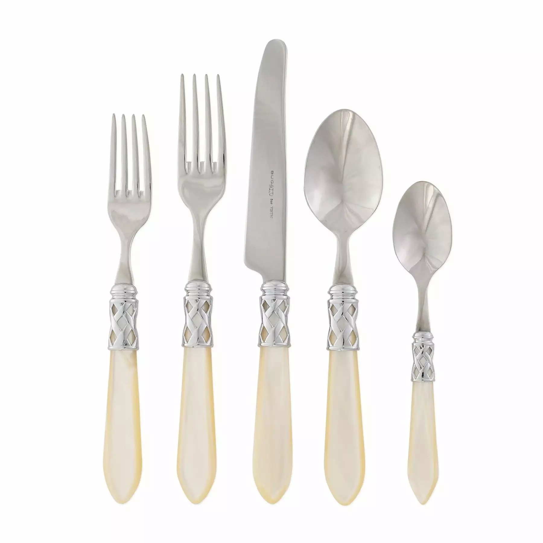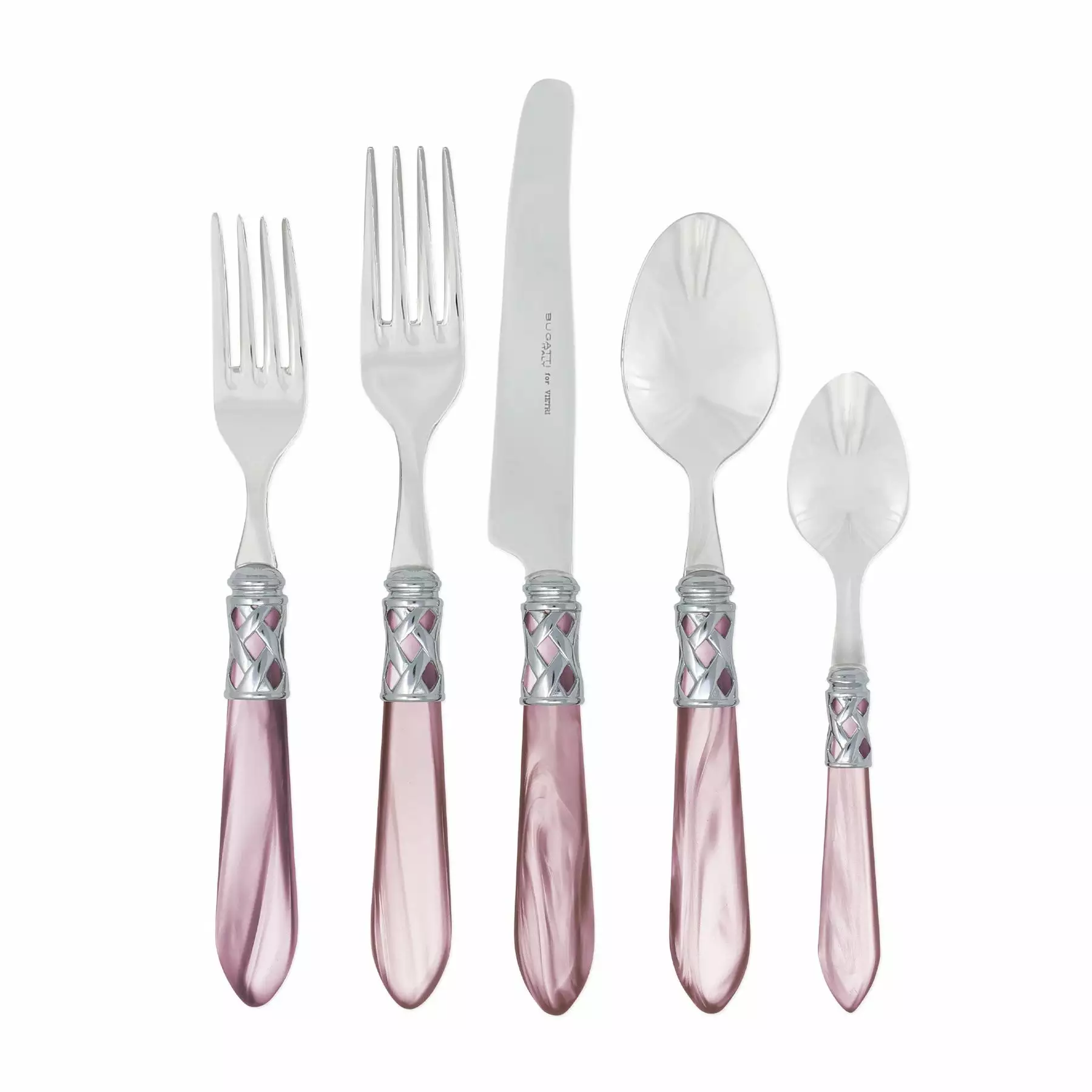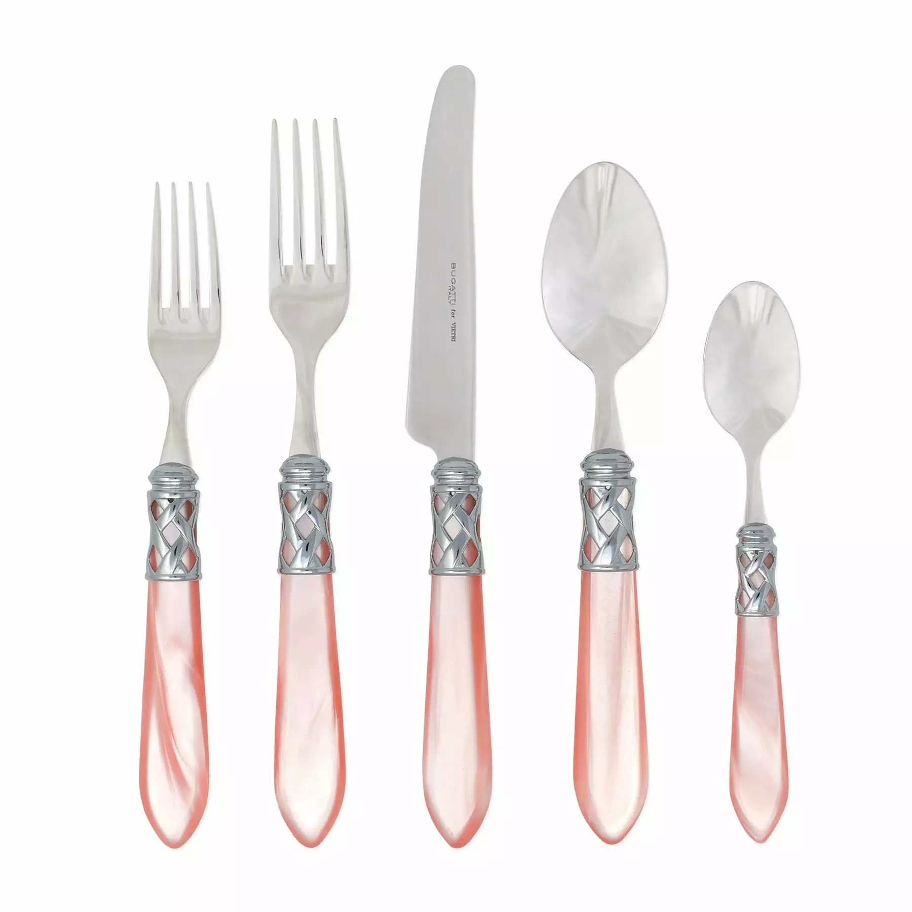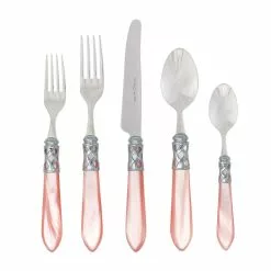 The Aladdin Brilliant Five-Piece Place Setting features elegant pearlized handles with the strength of high-grade acrylic and 18/10 stainless steel. The brilliant finish on the handle has a sophisticated, updated look.
