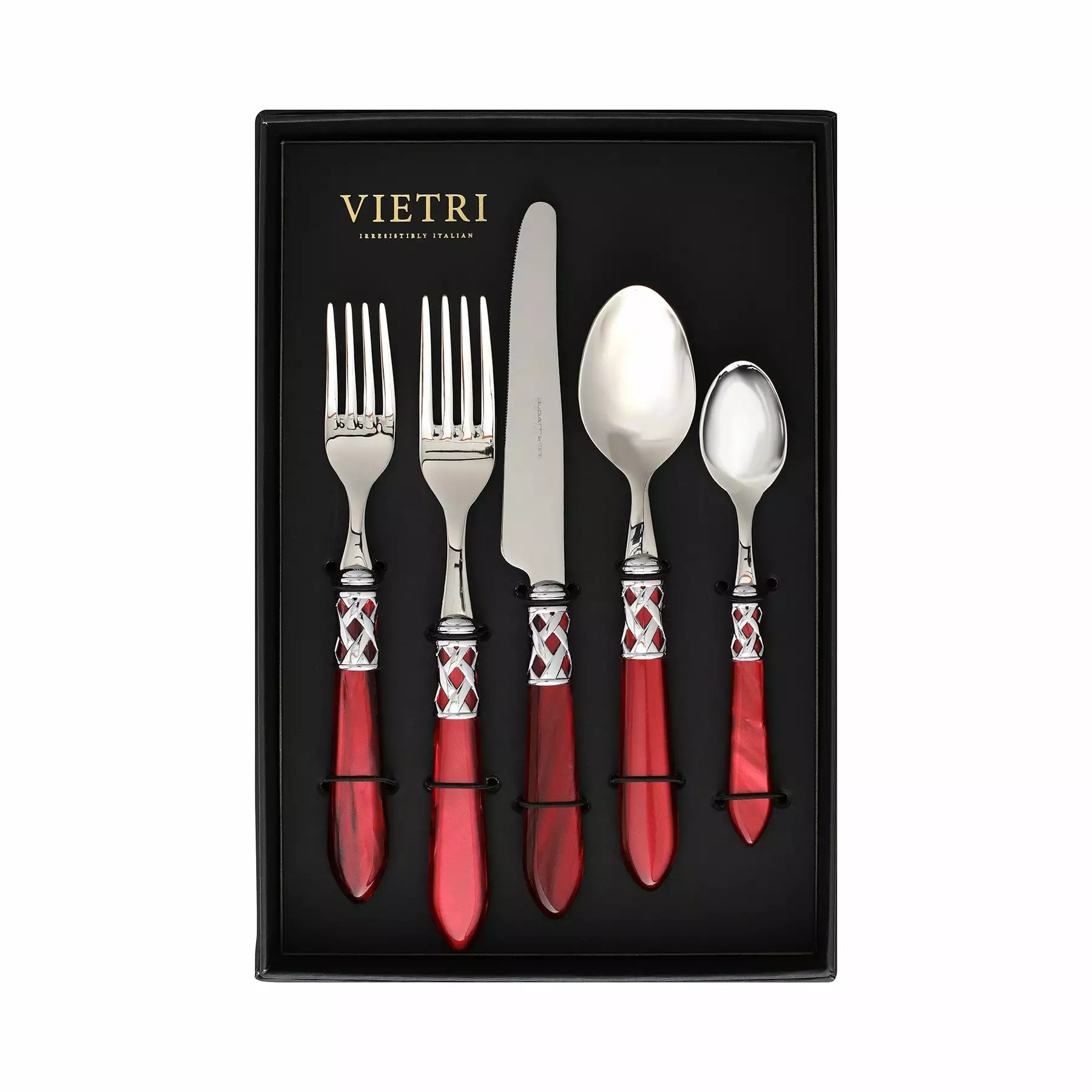 The Aladdin Brilliant Five-Piece Place Setting (Set of 4) features elegant pearlized handles with the strength of high-grade acrylic and 18/10 stainless steel. The brilliant finish on the handle has a sophisticated, updated look.