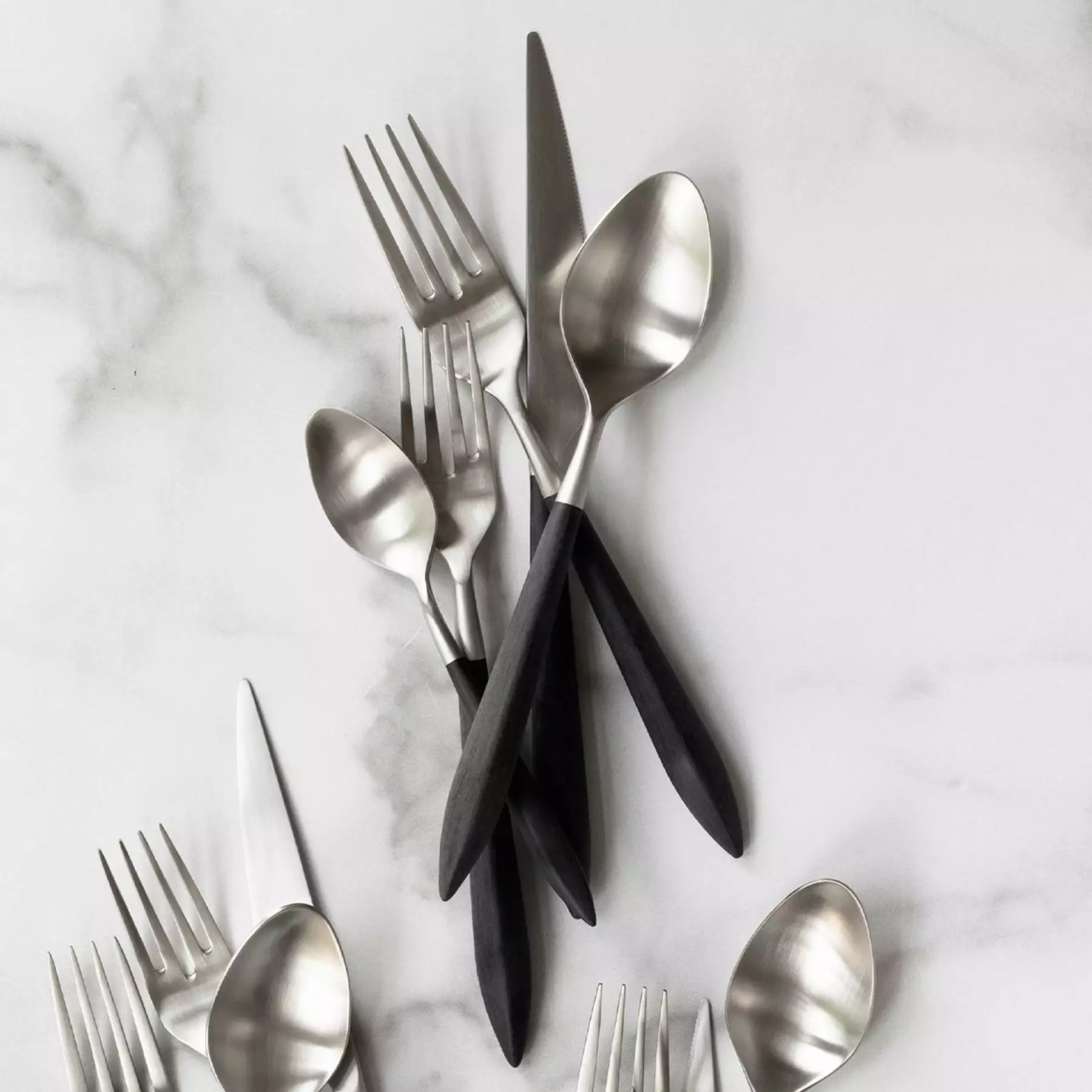 The contemporary matte handle found on the Ares Argento & Black Five-Piece Place Setting provides perfect balance and weight for a luxury flatware experience. Argento, the brushed silver, finishes off the utensil in 18/10 stainless steel.
