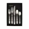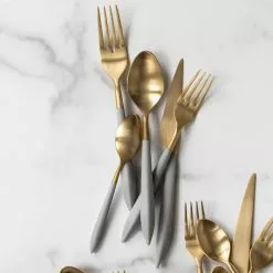 The contemporary matte handle found on the Ares Oro & Light Gray Five-Piece Place Setting provides perfect balance and weight for a luxury flatware experience. Oro, the brushed gold, finishes off the utensil in 18/10 stainless steel.