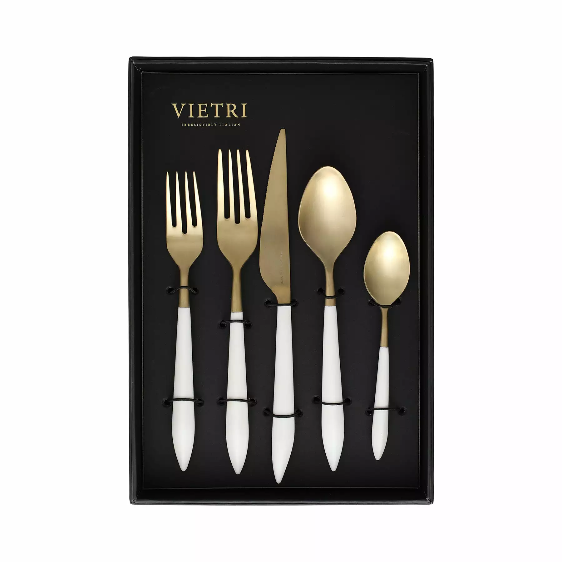The contemporary matte handle found on the Ares Oro & White Five-Piece Place Setting (Set of 4) provides perfect balance and weight for a luxury flatware experience. Oro, the brushed gold, finishes off the utensil in 18/10 stainless steel.