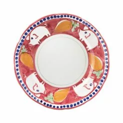 The colorful Campagna Porco Dinner Plate features whimsical handpainted pigs and carrots.