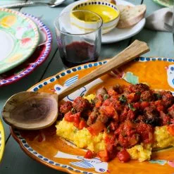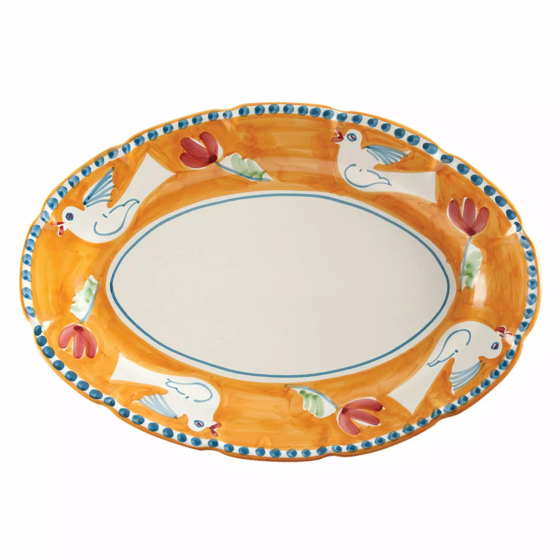 The colorful orange and blue Campagna Uccello Oval Platter features whimsical handpainted birds and flowers. Mix with other animals from the Campagna collection to create a fun table that captures the vitality of the Italian countryside!