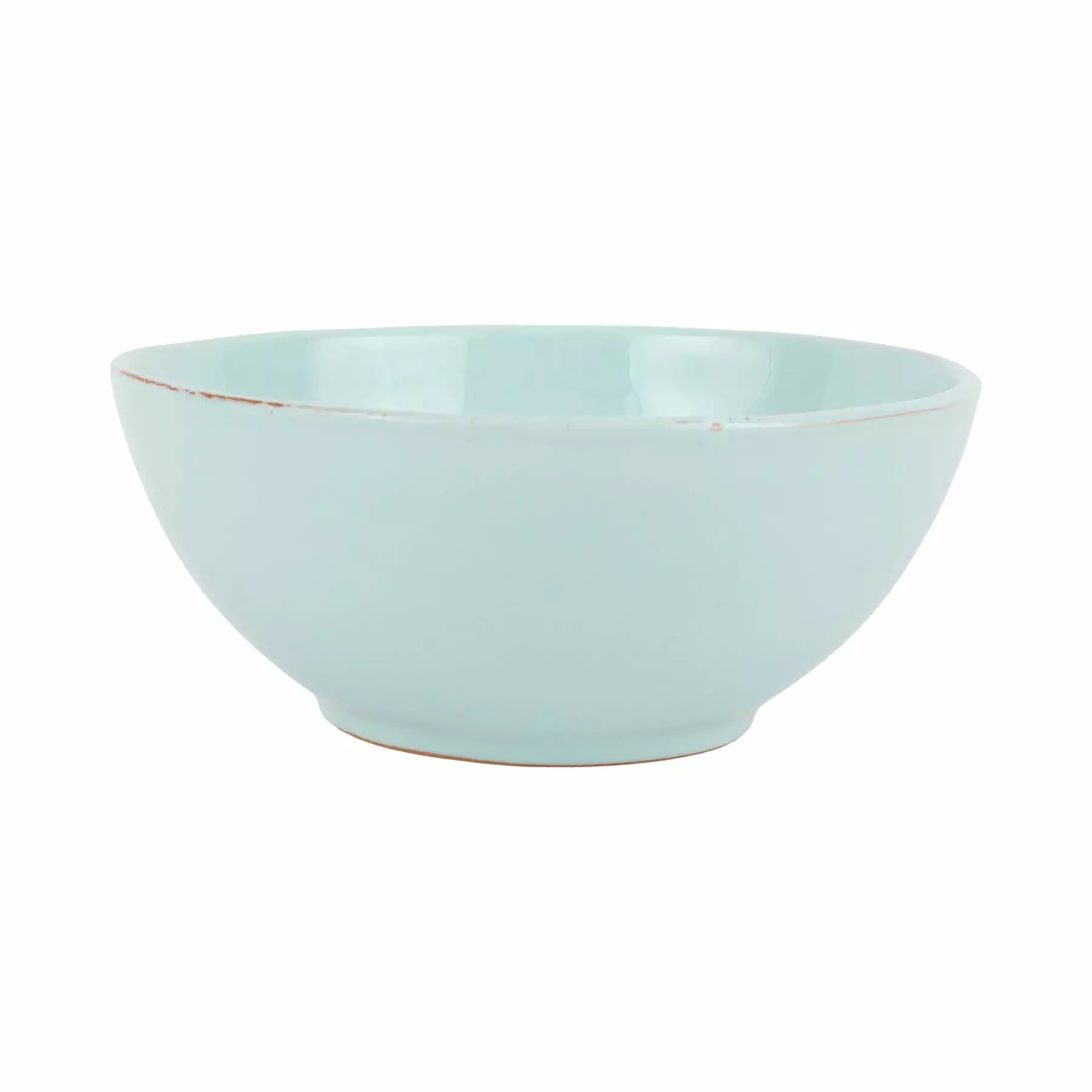 The Cucina Fresca Aqua Small Serving Bowl features raw terra cotta edges and a cool blue glaze reminiscent of the expansive Tuscan sky. The collection was inspired by the rustic, simple pottery of 14th-century Italy.