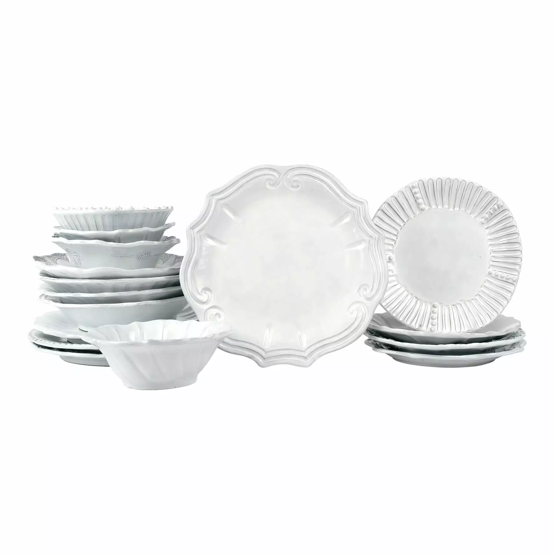 Italian for enchantment, Incanto is inspired by Italy’s art, landscape, and Venetian history. The soft ripples of the Adriatic Sea, the columns of the Palladian villas along the Brenta River, the beautiful lace of Venice’s Burano Island, and 17th century baroque architecture are reimagined in the dinnerware’s design, and the result is a captivating collection made to be mixed and matched. The Incanto Assorted Sixteen-Piece Place Setting includes four assorted European dinner plates, four assorted salad plates, four assorted pasta bowls, and four assorted cereal bowls.