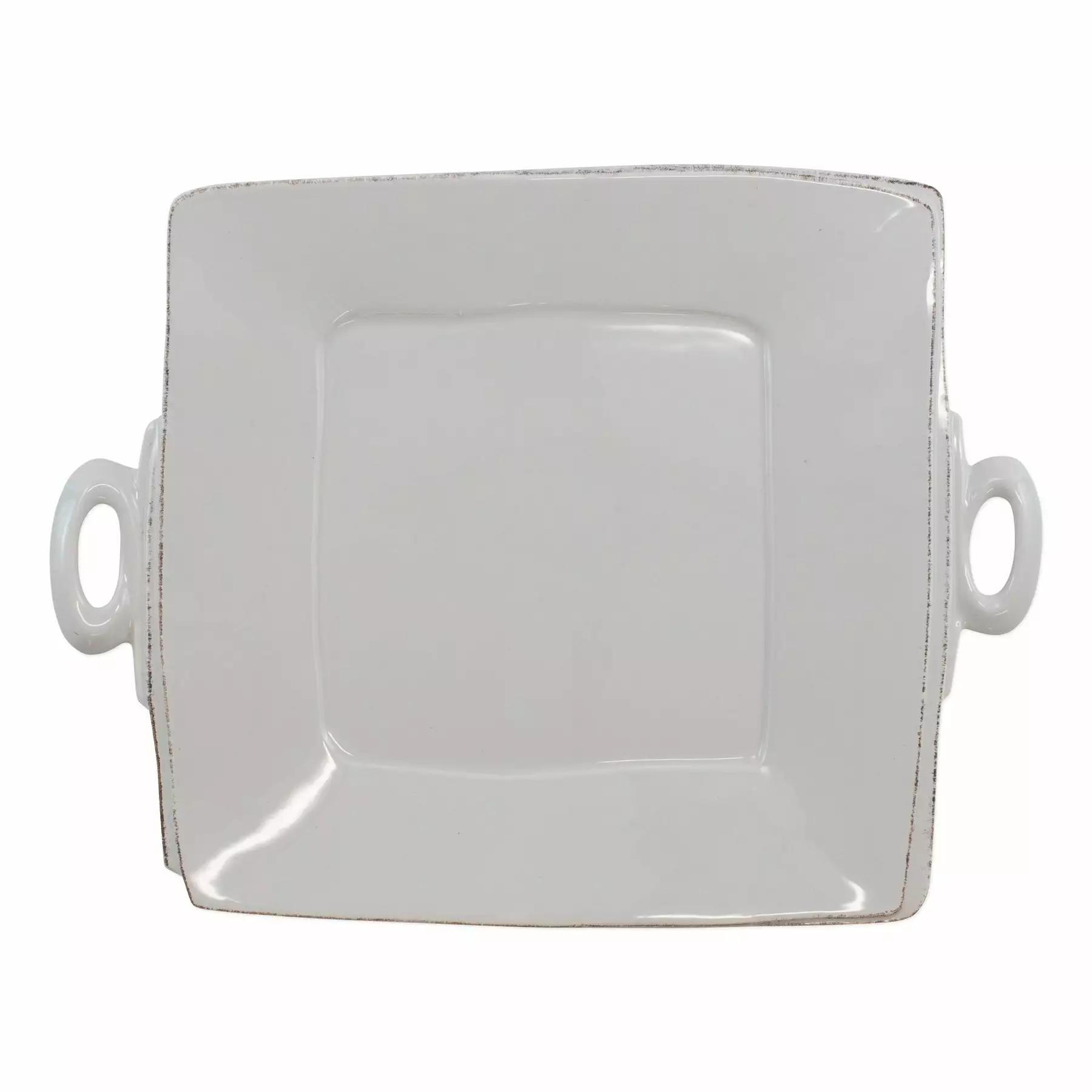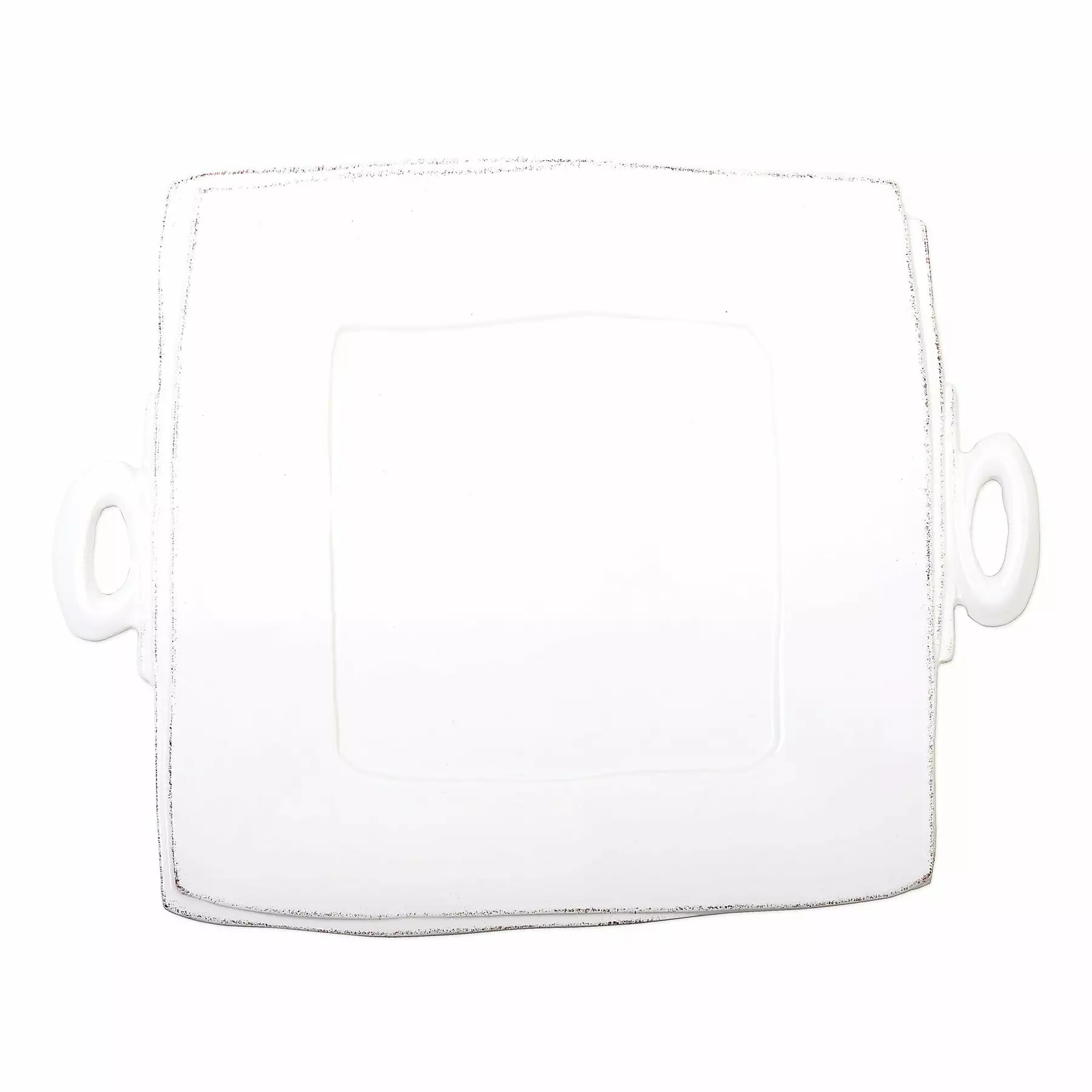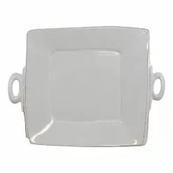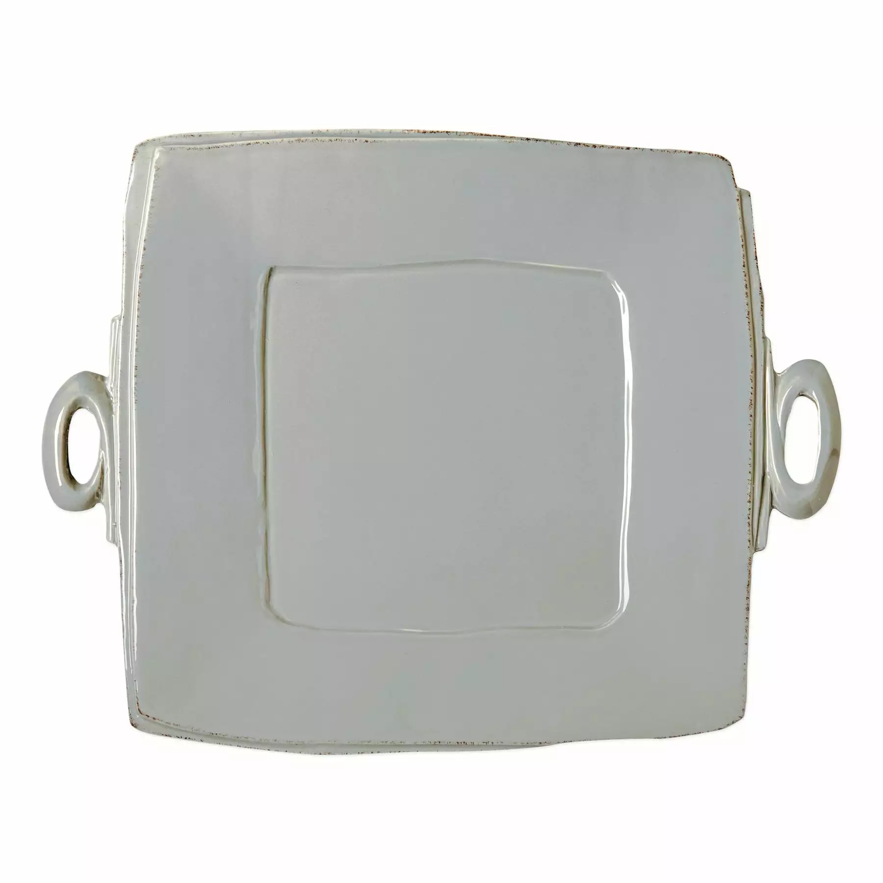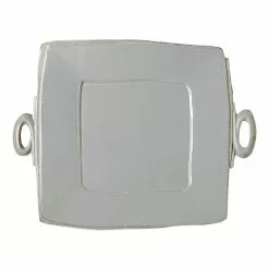 Beloved for its sophisticated simplicity, versatility, and durability, Lastra is our bestselling collection. The understated elegance, clean lines, and unique shape of the Lastra Handled Square Platter make a timeless and elegant serving piece for any table. Lastra’s design was inspired by the circular wooden slabs used for centuries to create the outer mold in cheesemaking throughout Italy. When fashioned together with twine, the hoop was left with a slight overlap to help maintain the shape of the cheese mold. Maestro molder Stefano Roselli incorporates the overlapping detail into the entire design, from its foot to its rim. A dark dusting on the edges of each piece suggests the ash that was used to preserve these cheeses and highlights each unique silhouette.