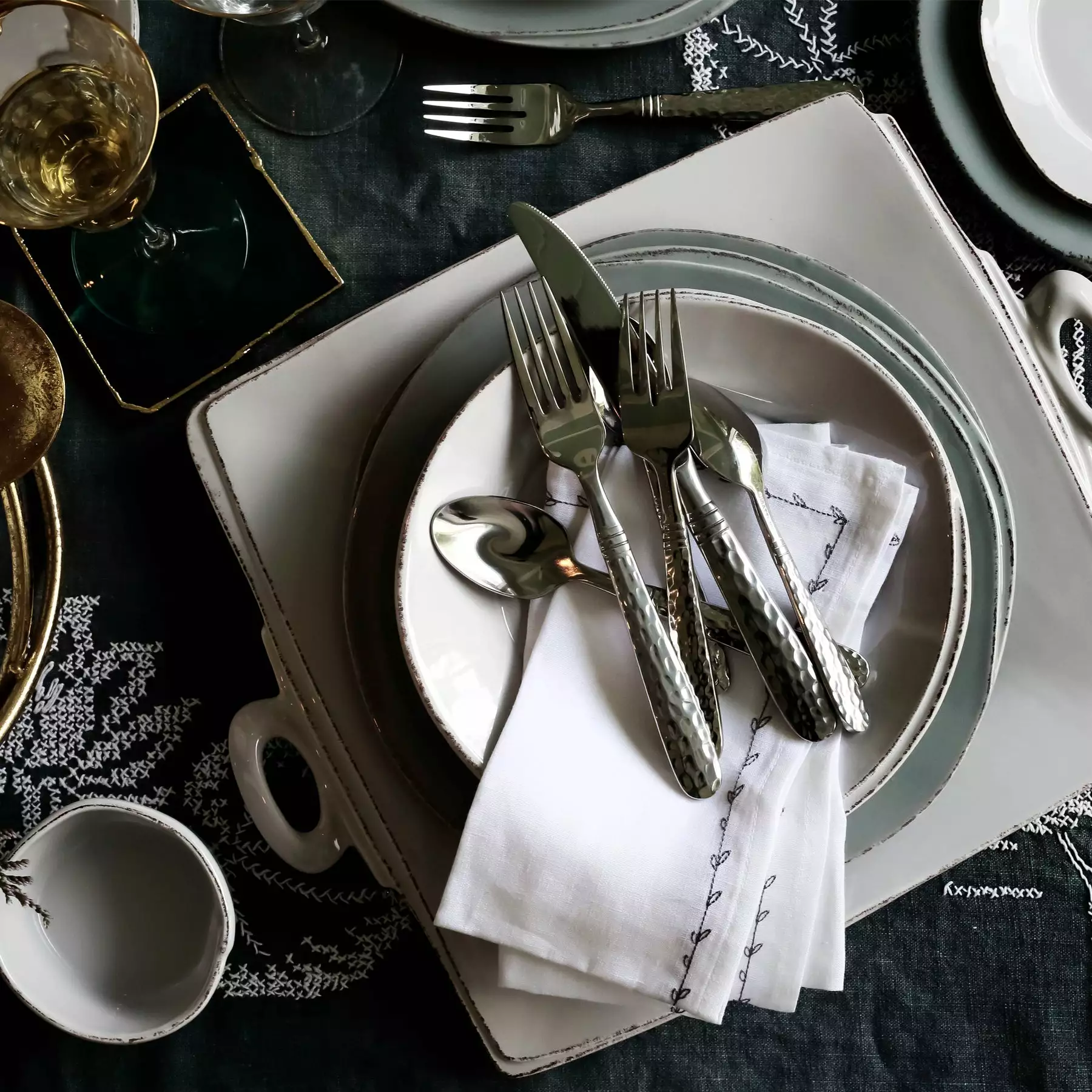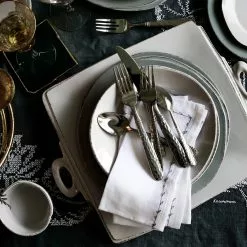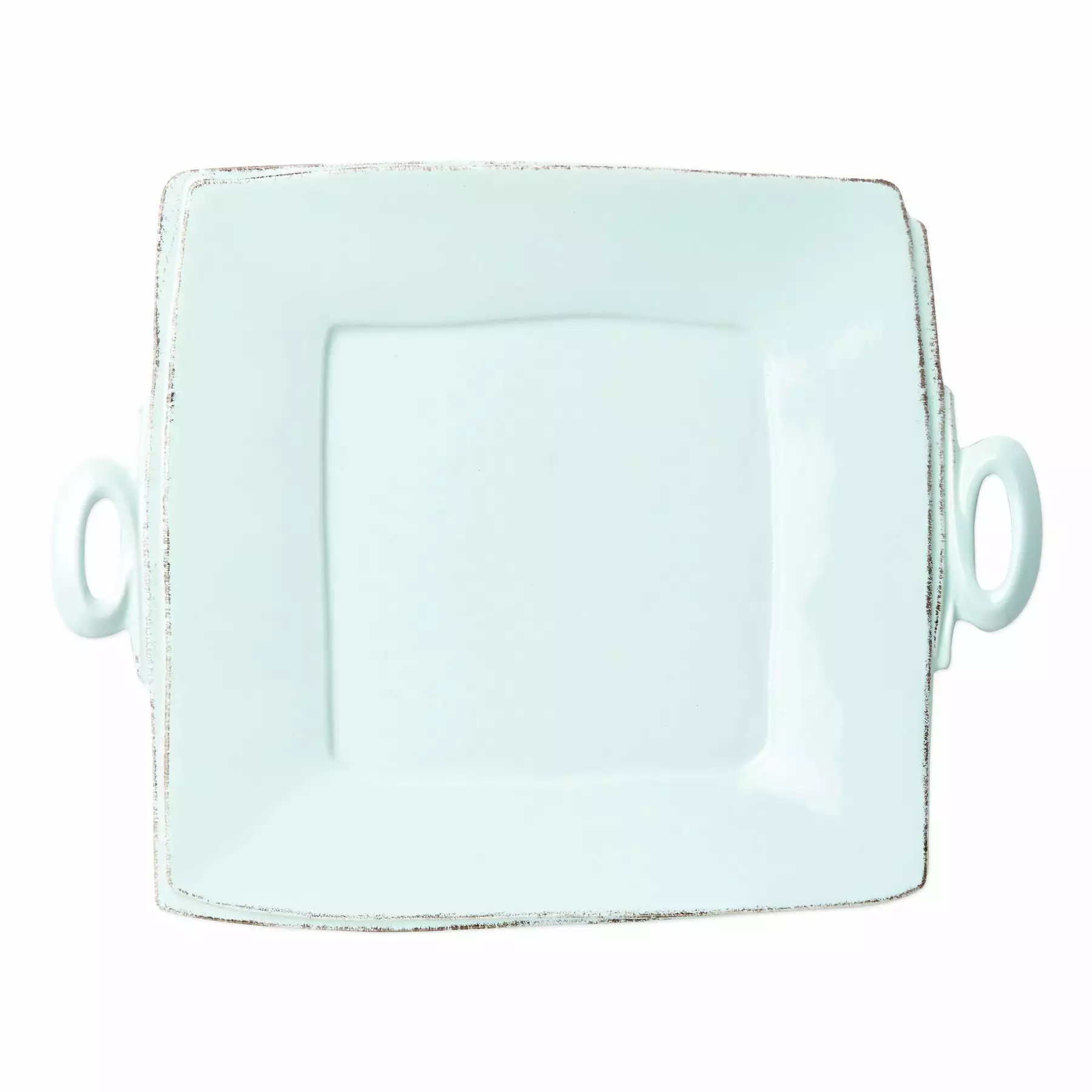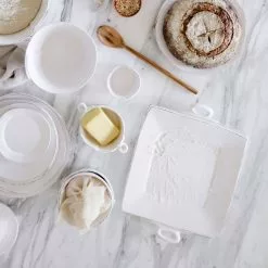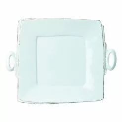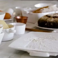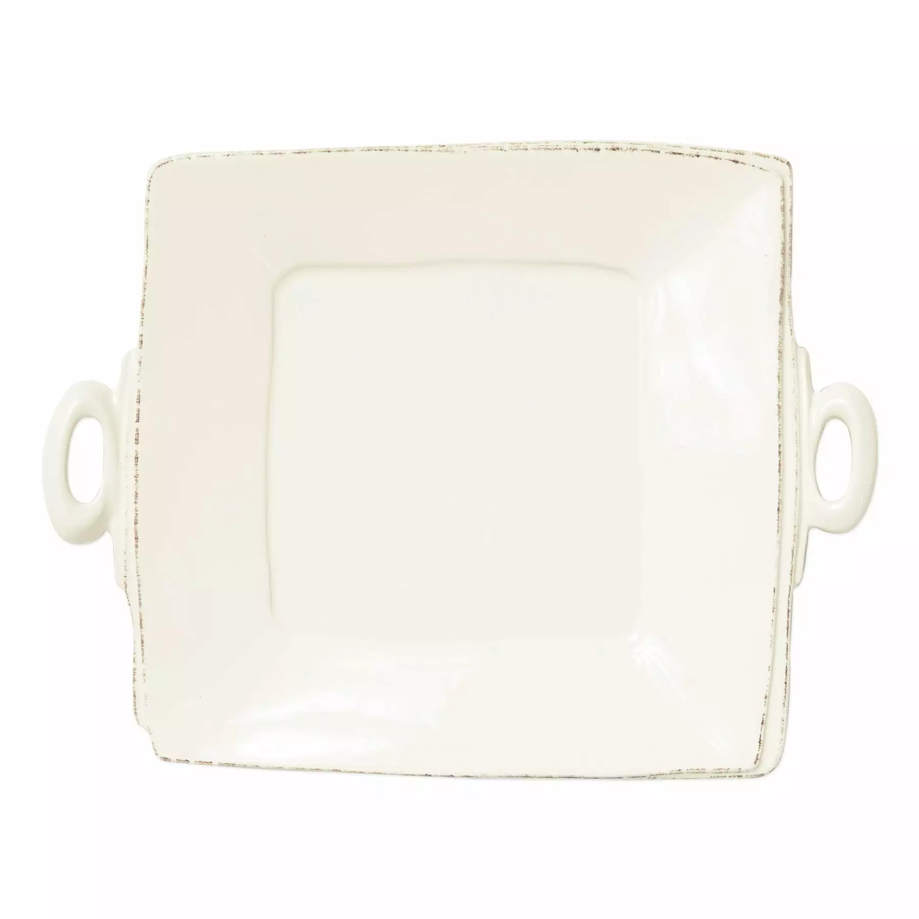 Beloved for its sophisticated simplicity, versatility, and durability, Lastra is our bestselling collection. The understated elegance, clean lines, and unique shape of the Lastra Handled Square Platter make a timeless and elegant serving piece for any table. Lastra’s design was inspired by the circular wooden slabs used for centuries to create the outer mold in cheesemaking throughout Italy. When fashioned together with twine, the hoop was left with a slight overlap to help maintain the shape of the cheese mold. Maestro molder Stefano Roselli incorporates the overlapping detail into the entire design, from its foot to its rim. A dark dusting on the edges of each piece suggests the ash that was used to preserve these cheeses and highlights each unique silhouette.