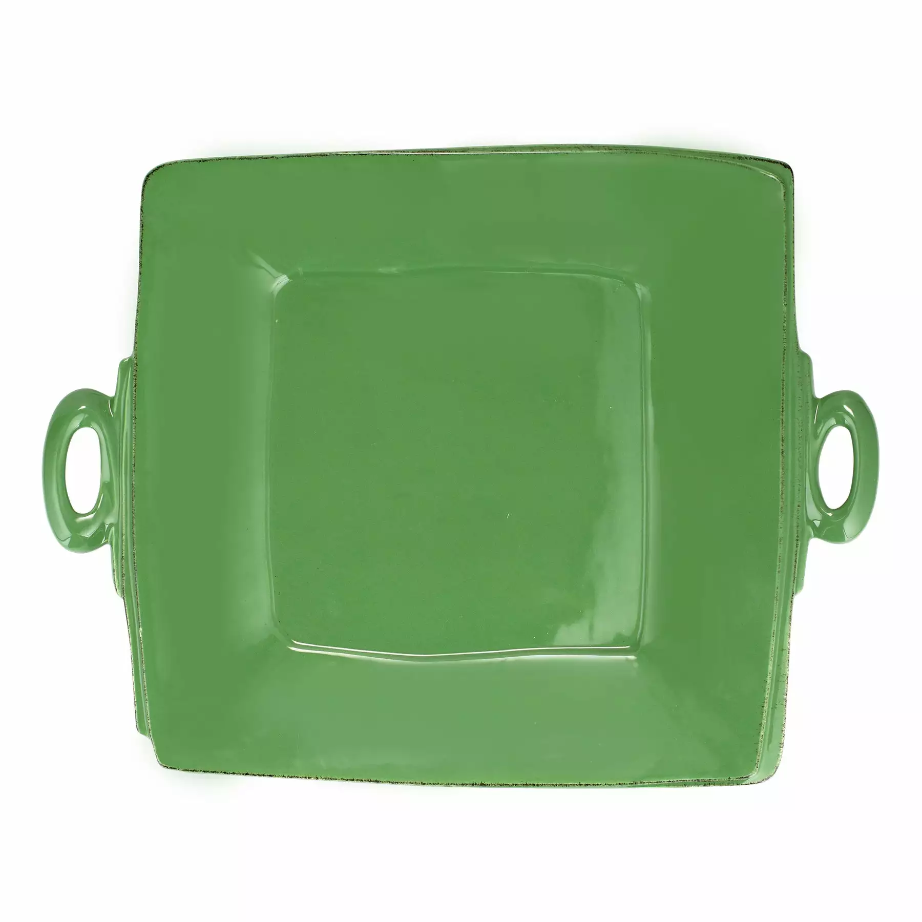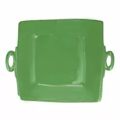 Oven Safe – VIETRI’s casserole and baking dishes can be used in most conventional ovens and dishwashers. They are handcrafted of very dense clays and fired at high temperatures, making them heat resistant up to 400°F. Do not use casserole lids in the oven, unless otherwise noted. Hot casseroles and baking dishes should never be placed on cool, damp, or unprotected surfaces. VIETRI bakeware should never be taken directly from the refrigerator to the oven due to the extreme temperature change, nor should it be placed directly from oven to freezer. The handles of these pieces are decorative and should not be used for support. Please remove the bakeware from the oven by holding the body of the dish, supporting the base.