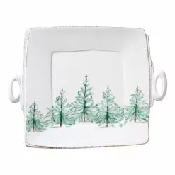 Make time for your loved ones when you gather around the cheerful design of the Lastra Holiday 4-Piece Serveware Set. Featuring handpainted fir trees, the Handled Square Platter, Oval Platter, Round Platter, and Handled Rectangular Platter make it easy to delight in the magic of the holiday season.
