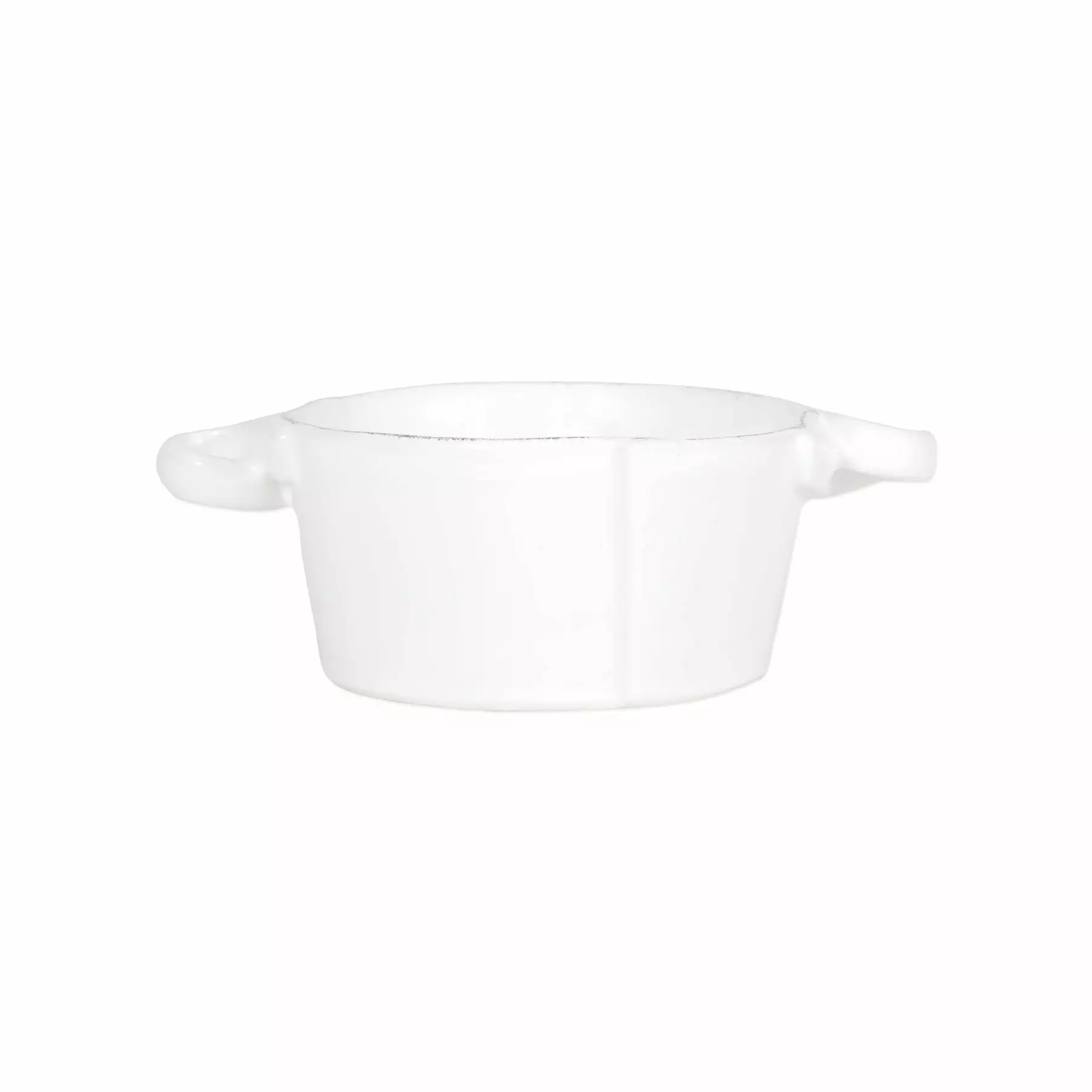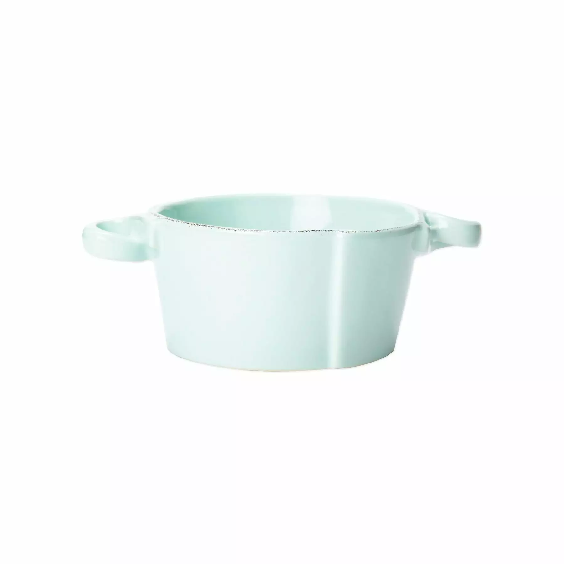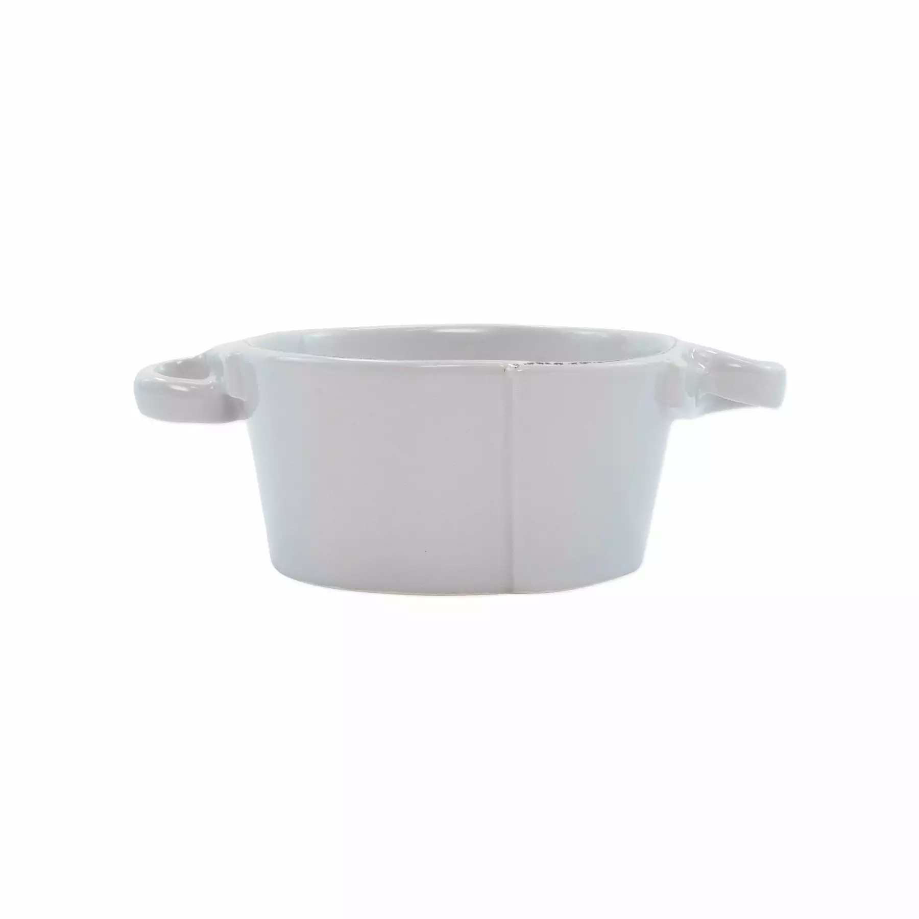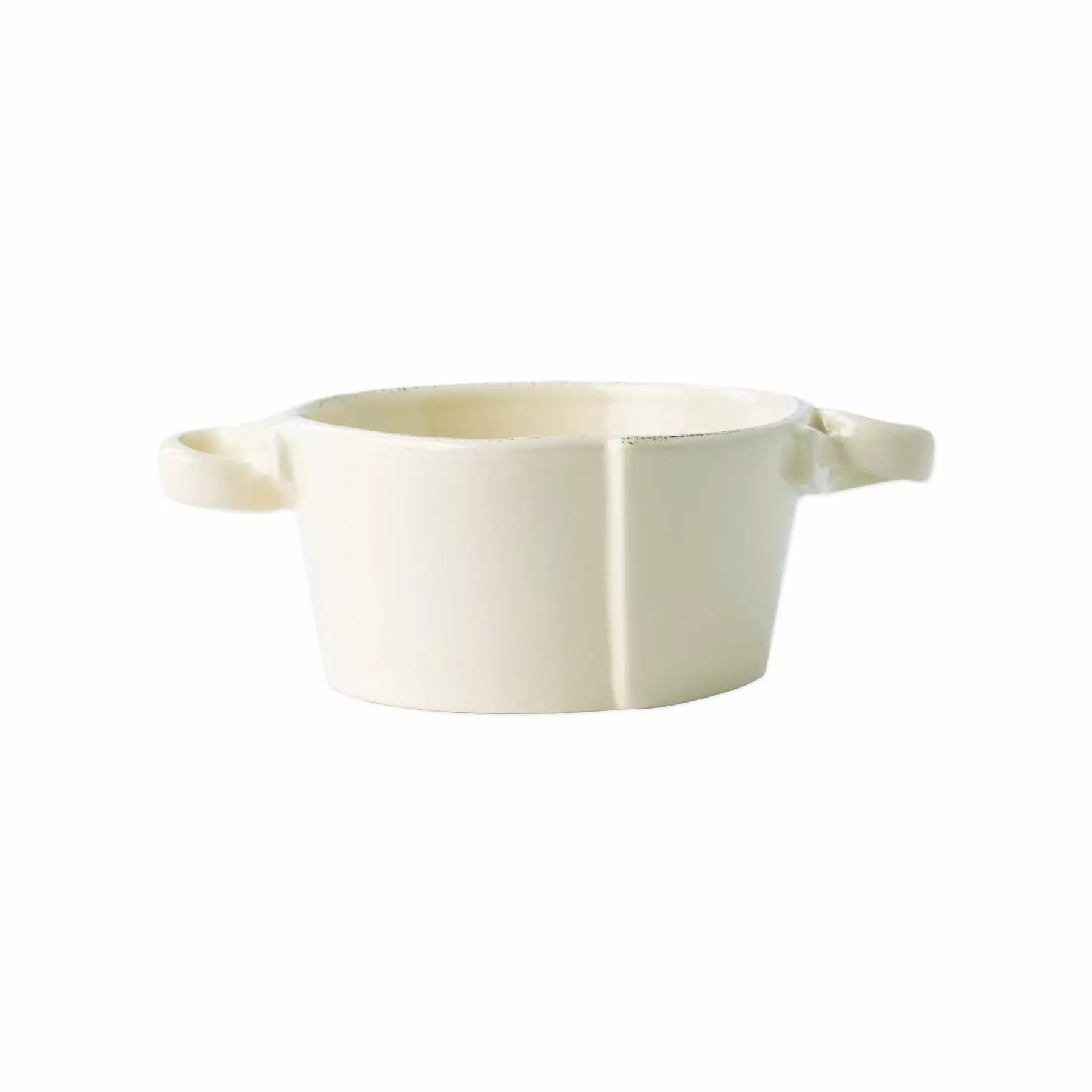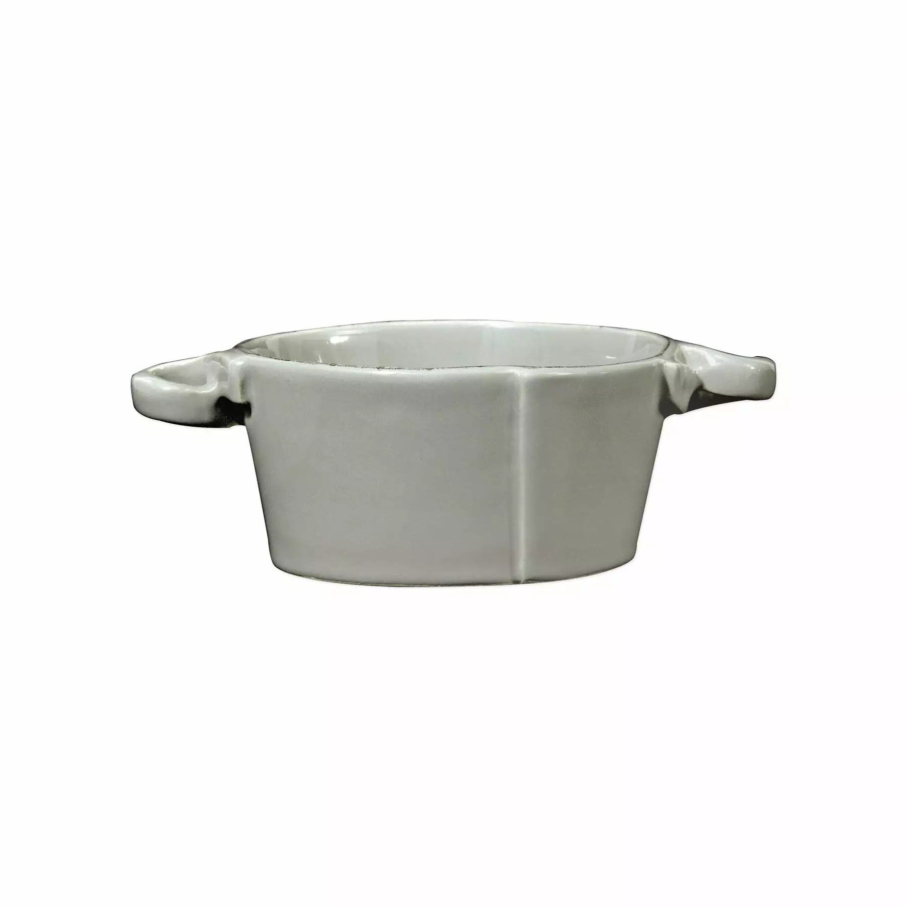 Beloved for its sophisticated simplicity, versatility, and durability, Lastra is our bestselling collection. The understated elegance, clean lines, and unique shape of the Lastra Small Handled Bowl make it a timeless piece for your kitchen and table. With sturdy handles, this piece is an excellent choice for serving warm soups or stews. Lastra’s design was inspired by the circular wooden slabs used for centuries to create the outer mold in cheesemaking throughout Italy. When fashioned together with twine, the hoop was left with a slight overlap to help maintain the shape of the cheese mold. Maestro molder Stefano Roselli incorporates the overlapping detail into the entire design, from its foot to its rim. A dark dusting on the edges of each piece suggests the ash that was used to preserve these cheeses and highlights each unique silhouette.