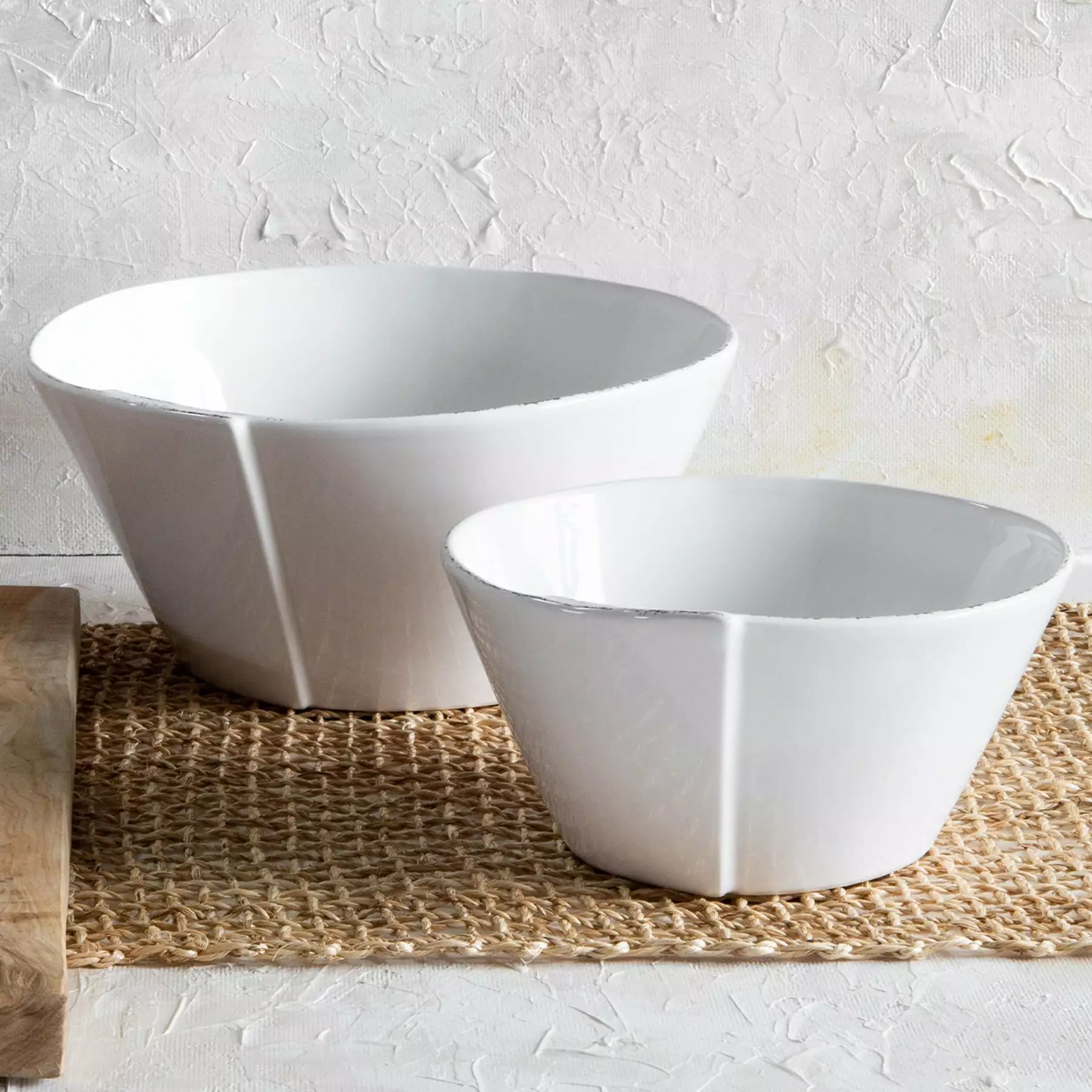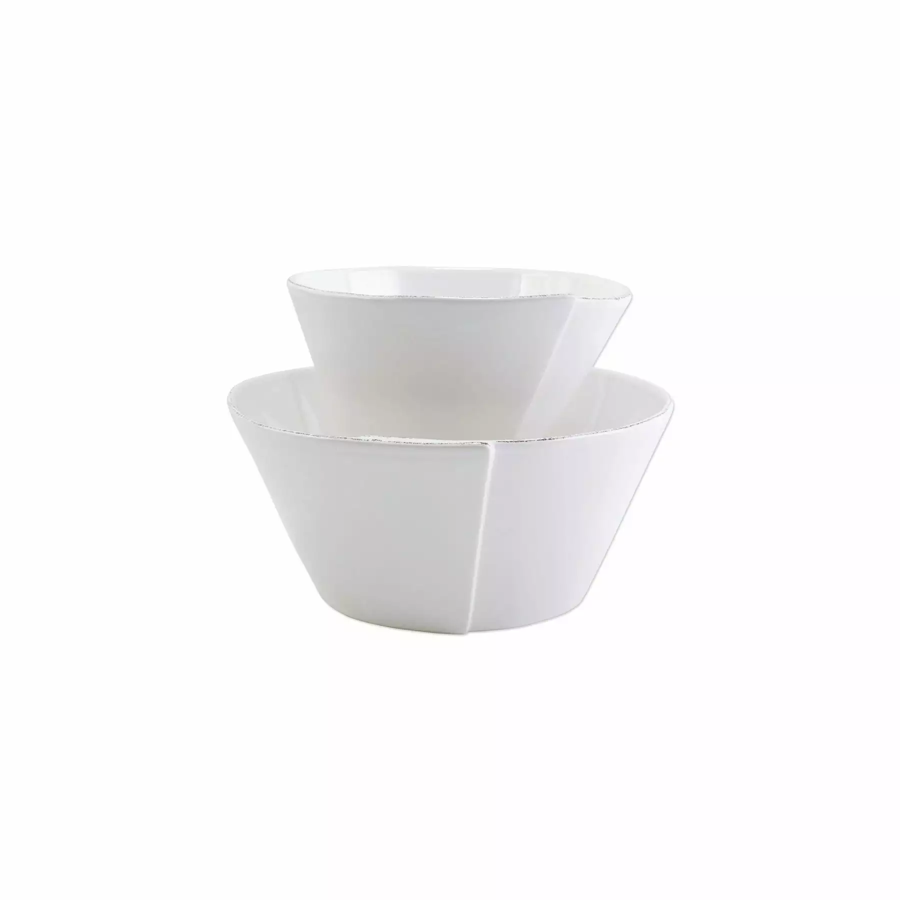 Beloved for its sophisticated simplicity, versatility, and durability, Lastra is our bestselling collection. The Lastra White Two-Piece Serving Bowl Set includes the Lastra White Medium Stacking Serving Bowl and the Lastra White Large Stacking Serving Bowl. It is a beautiful set for anyone who likes to cook or entertain. Lastra’s design was inspired by the circular wooden slabs used for centuries to create the outer mold in cheesemaking throughout Italy. When fashioned together with twine, the hoop was left with a slight overlap to help maintain the shape of the cheese mold. Maestro molder Stefano Roselli incorporates the overlapping detail into the entire design, from its foot to its rim. A dark dusting on the edges of each piece suggests the ash that was used to preserve these cheeses and highlights each unique silhouette.