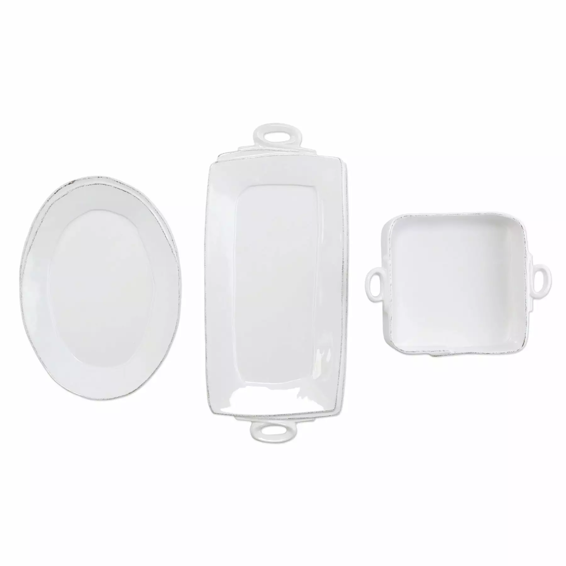 Beloved for its sophisticated simplicity, versatility, and durability, Lastra is our bestselling collection. The Lastra White 3-Piece Hostess Set includes the Lastra White Square Baker, the Lastra White Handled Rectangular Platter, and the Lastra White Small Oval Platter. It is a beautiful set for anyone who likes to cook or entertain. Lastra’s design was inspired by the circular wooden slabs used for centuries to create the outer mold in cheesemaking throughout Italy. When fashioned together with twine, the hoop was left with a slight overlap to help maintain the shape of the cheese mold. Maestro molder Stefano Roselli incorporates the overlapping detail into the entire design, from its foot to its rim. A dark dusting on the edges of each piece suggests the ash that was used to preserve these cheeses and highlights each unique silhouette