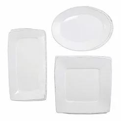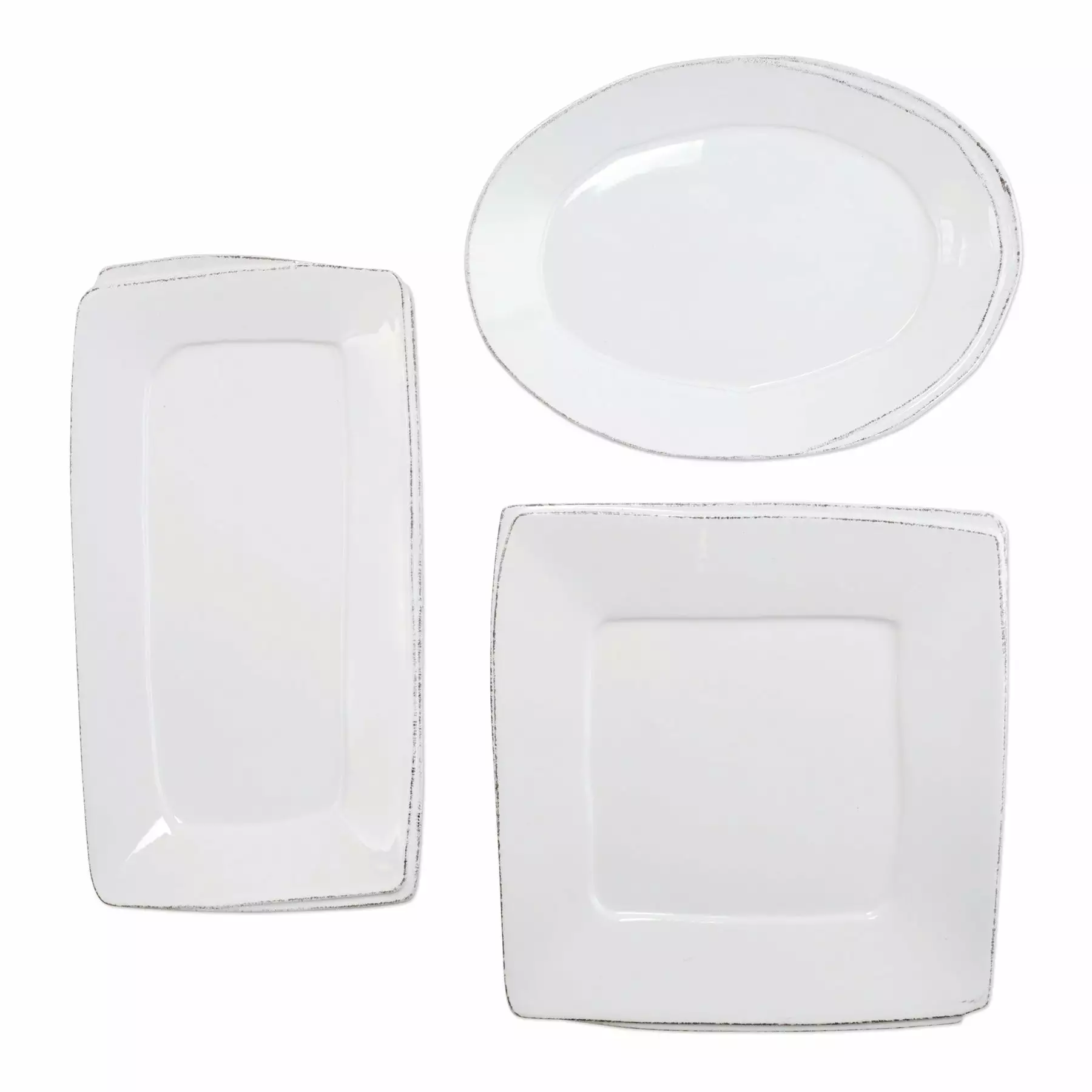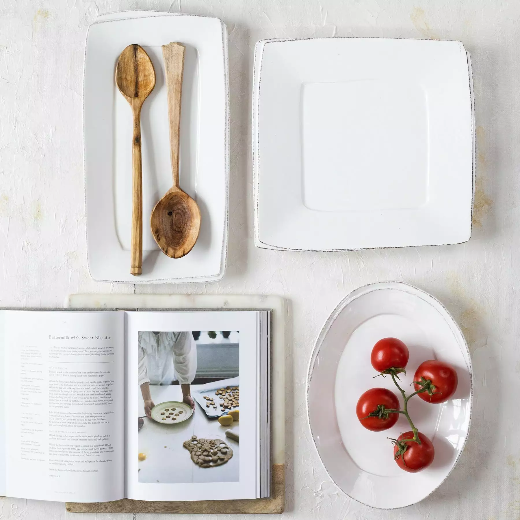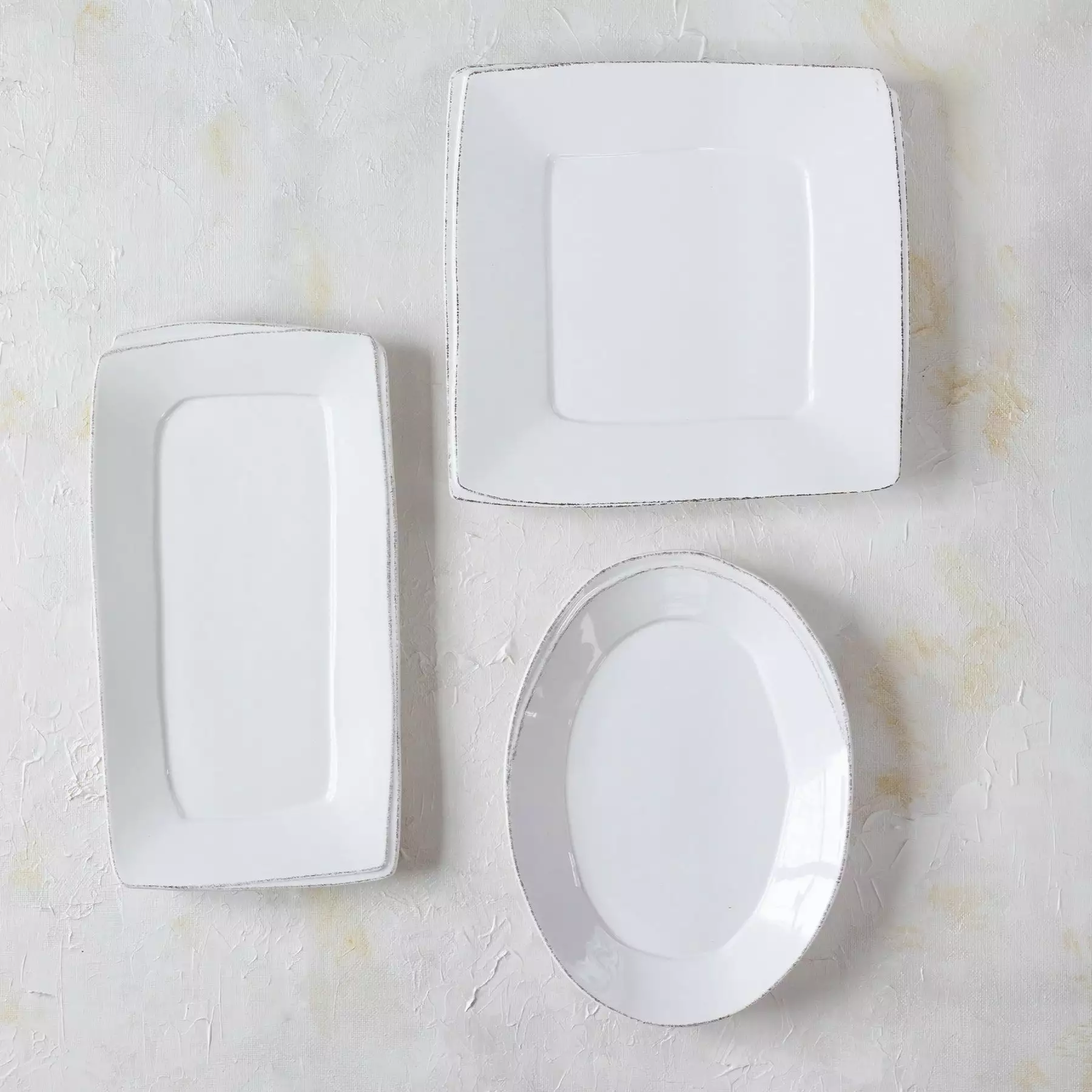 Beloved for its sophisticated simplicity, versatility, and durability, Lastra is our bestselling collection. The Lastra White Three-Piece Serveware Set includes the Lastra White Small Oval Platter, the Lastra White Square Platter, and the Lastra White Rectangular Platter. It is a beautiful set for anyone who likes to cook or entertain. Lastra’s design was inspired by the circular wooden slabs used for centuries to create the outer mold in cheesemaking throughout Italy. When fashioned together with twine, the hoop was left with a slight overlap to help maintain the shape of the cheese mold. Maestro molder Stefano Roselli incorporates the overlapping detail into the entire design, from its foot to its rim. A dark dusting on the edges of each piece suggests the ash that was used to preserve these cheeses and highlights each unique silhouette.