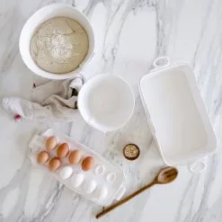 Beloved for its sophisticated simplicity, versatility, and durability, Lastra is our bestselling collection. The understated elegance, clean lines, and unique shape of the Lastra White Rectangular Baker make it a timeless baking and serving piece. Lastra’s design was inspired by the circular wooden slabs used for centuries to create the outer mold in cheesemaking throughout Italy. When fashioned together with twine, the hoop was left with a slight overlap to help maintain the shape of the cheese mold. Maestro molder Stefano Roselli incorporates the overlapping detail into the entire design, from its foot to its rim. A dark dusting on the edges of each piece suggests the ash that was used to preserve these cheeses and highlights each unique silhouette.