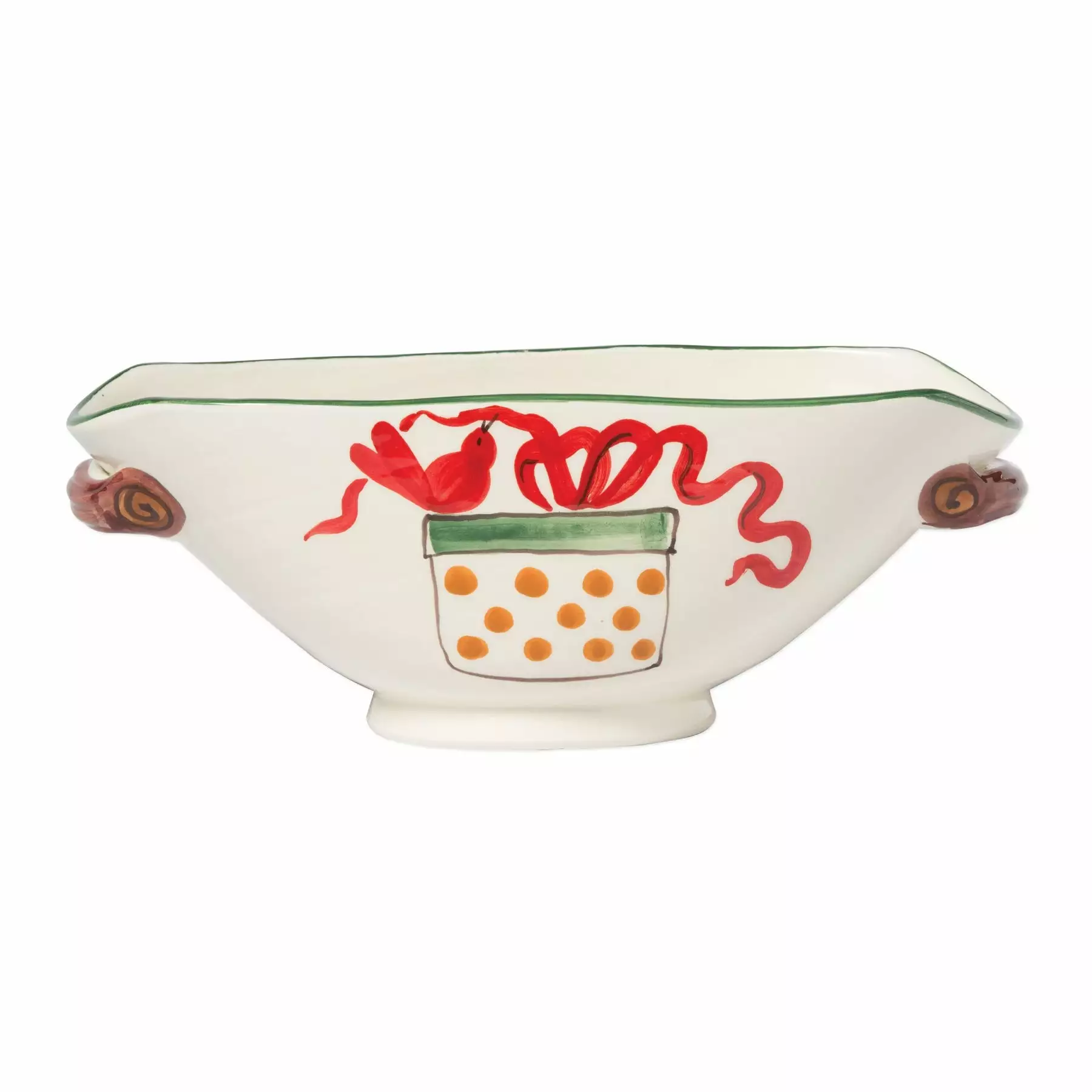 Collect your favorite holiday cards from friends and family in the Old St. Nick Handled White Oval Bowl with Presents. Handpainted in Tuscany, this decorative Christmas bowl provides us a glimpse into Old St. Nick’s daily adventures leading up to the holiday season.