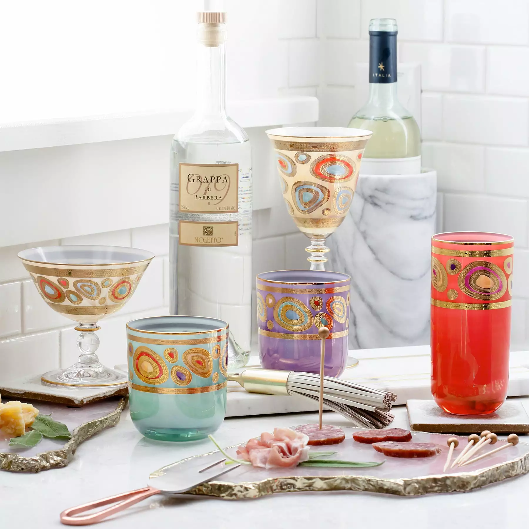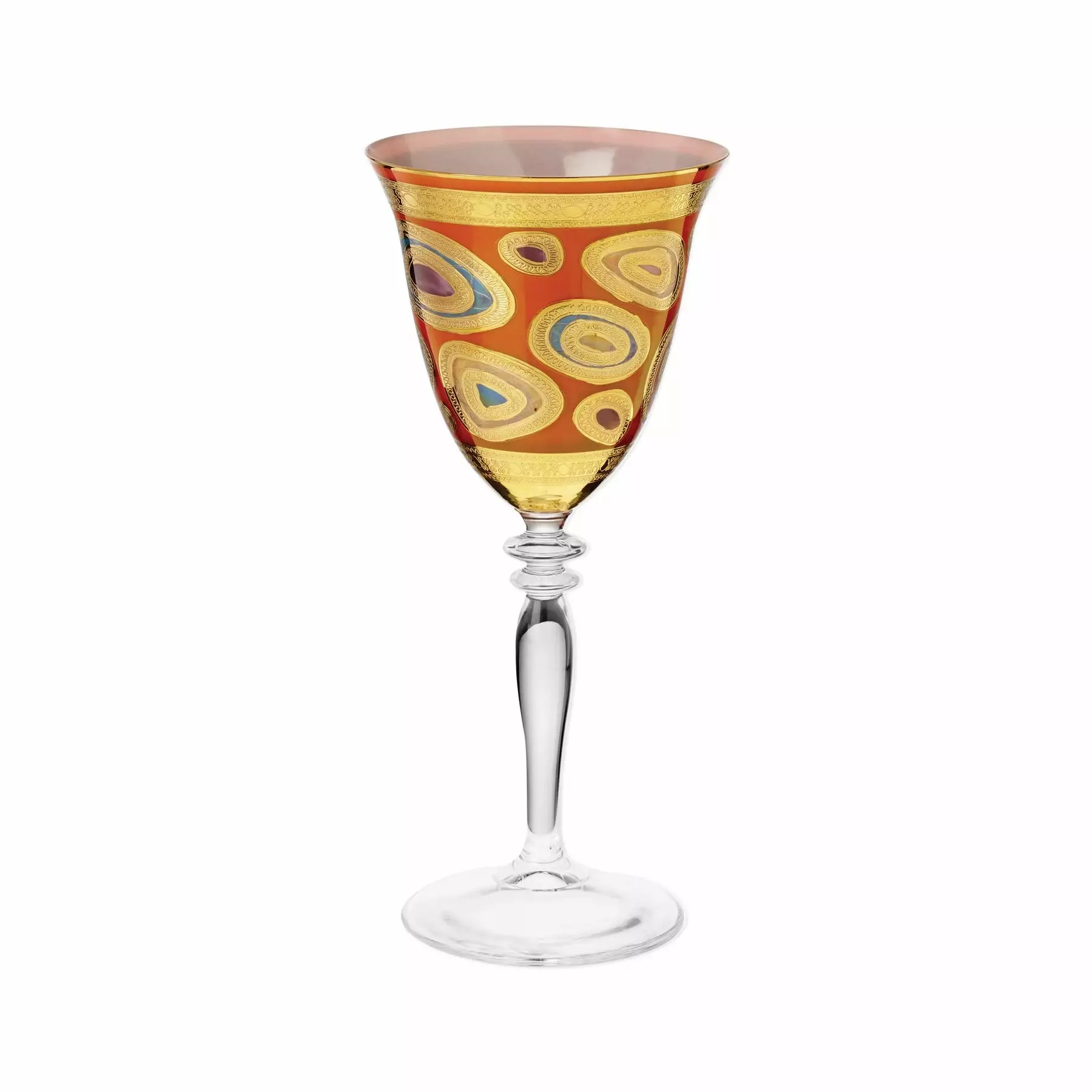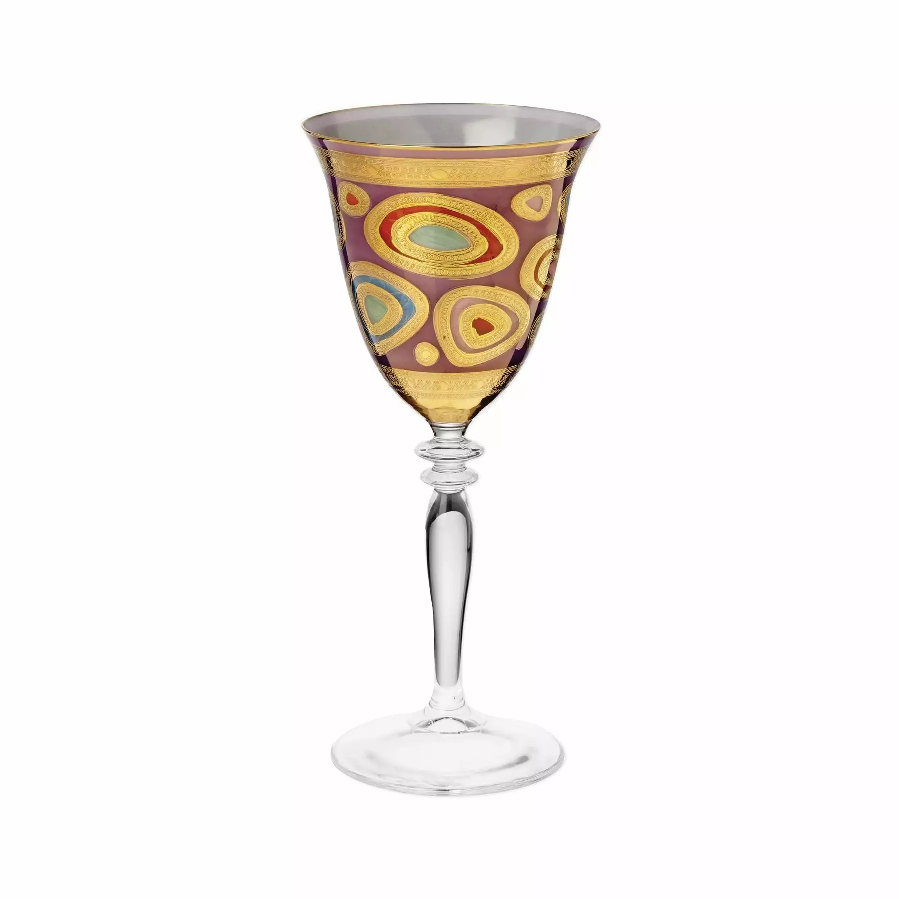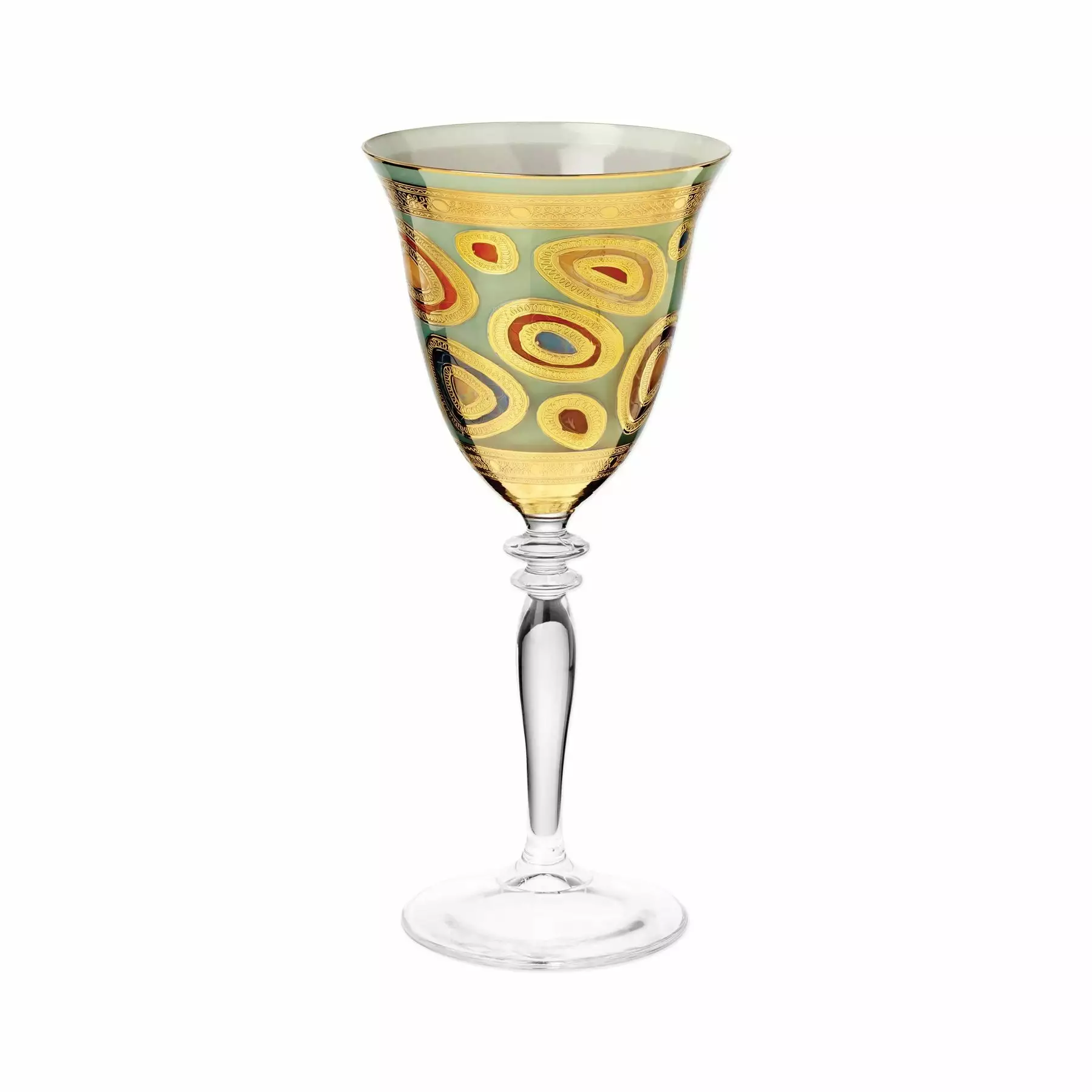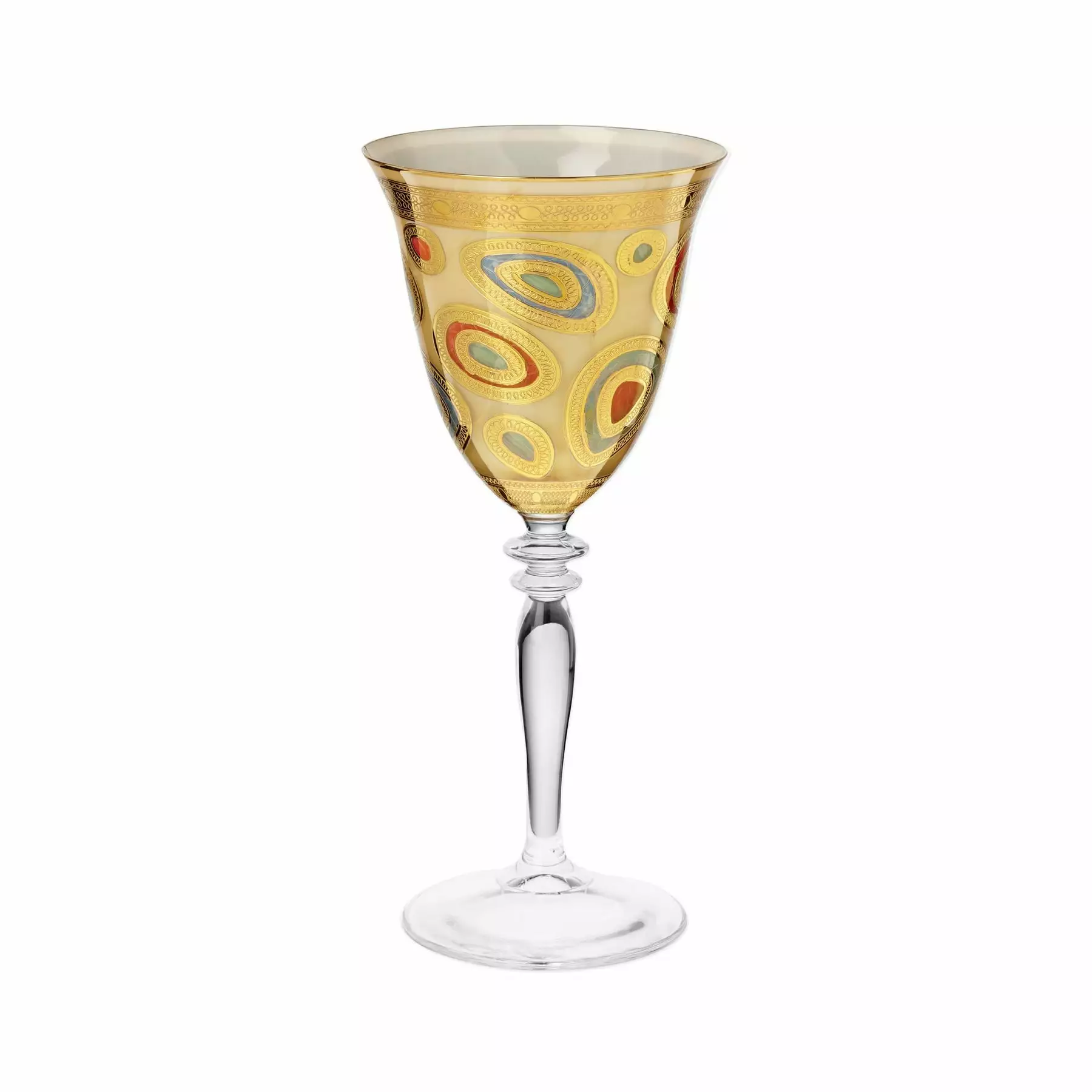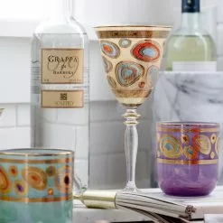 Our Regalia Drinkware collection was inspired by the ornate emblems and decorations that are indicative of royalty. The Regalia Cream Wine Glass is handpainted in 14-karat gold.