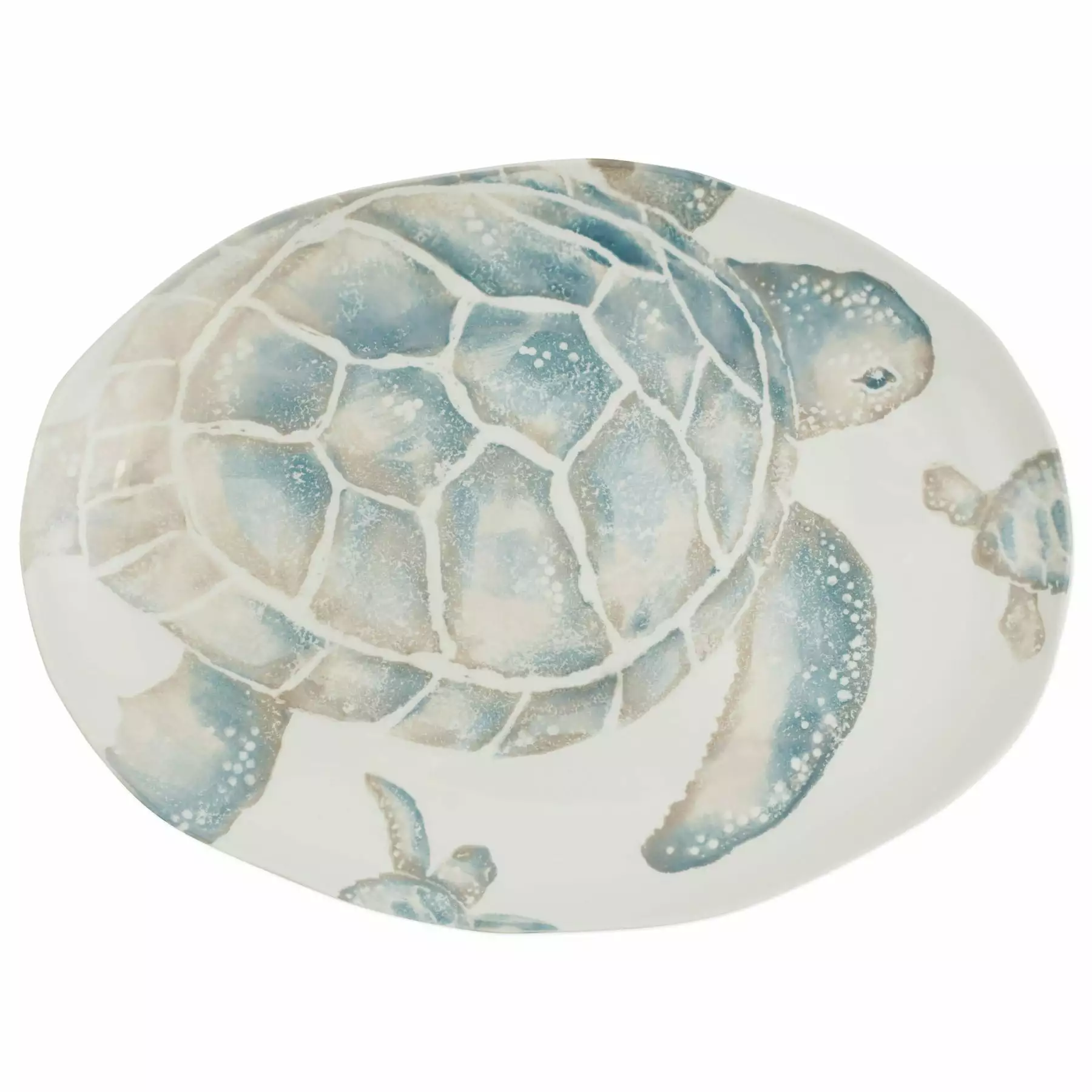 The handpainted sea turtle is rendered in hues of aqua and taupe against a clean, white canvas on the Tartaruga Medium Oval Platter. Maestro artisan, Gianluca Fabbro, utilizes a unique sponging technique to carefully add detail to each piece.