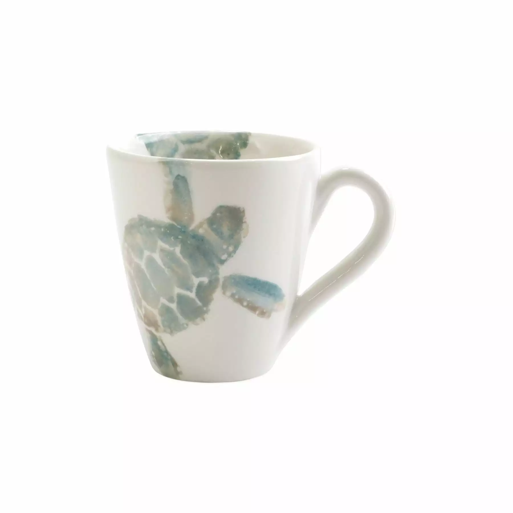 The handpainted sea turtle is rendered in hues of aqua and taupe against a clean, white canvas on the Tartaruga Coffee Mug. Maestro artisan, Gianluca Fabbro, utilizes a unique sponging technique to carefully add detail to each piece.