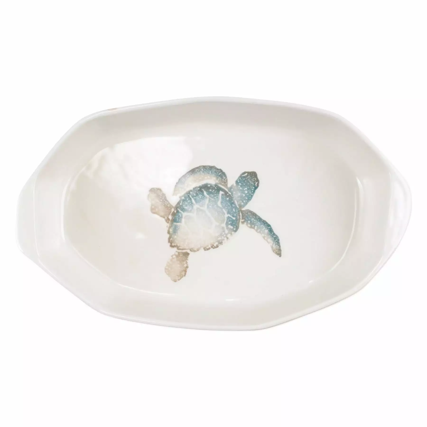 The handpainted sea turtle is rendered in hues of aqua and taupe against a clean, white canvas on the Tartaruga Rectangular Baker. Maestro artisan, Gianluca Fabbro, utilizes a unique sponging technique to carefully add detail to each piece.