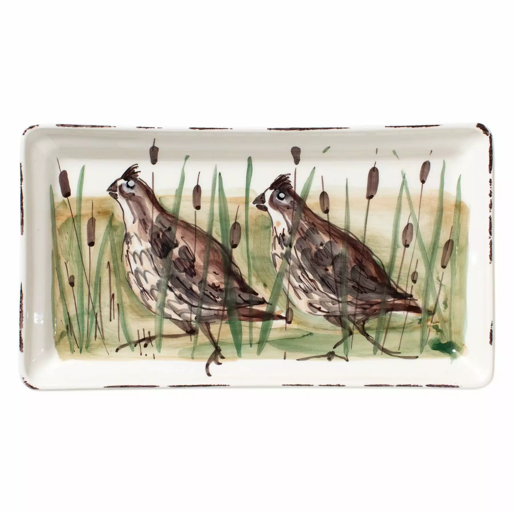 Handpainted in Tuscany, the Wildlife Quail Rectangular Platter brings the thrill of the hunt to your table. This whimsical collection combines a series of animals all representative of the grandeur of wildlife.