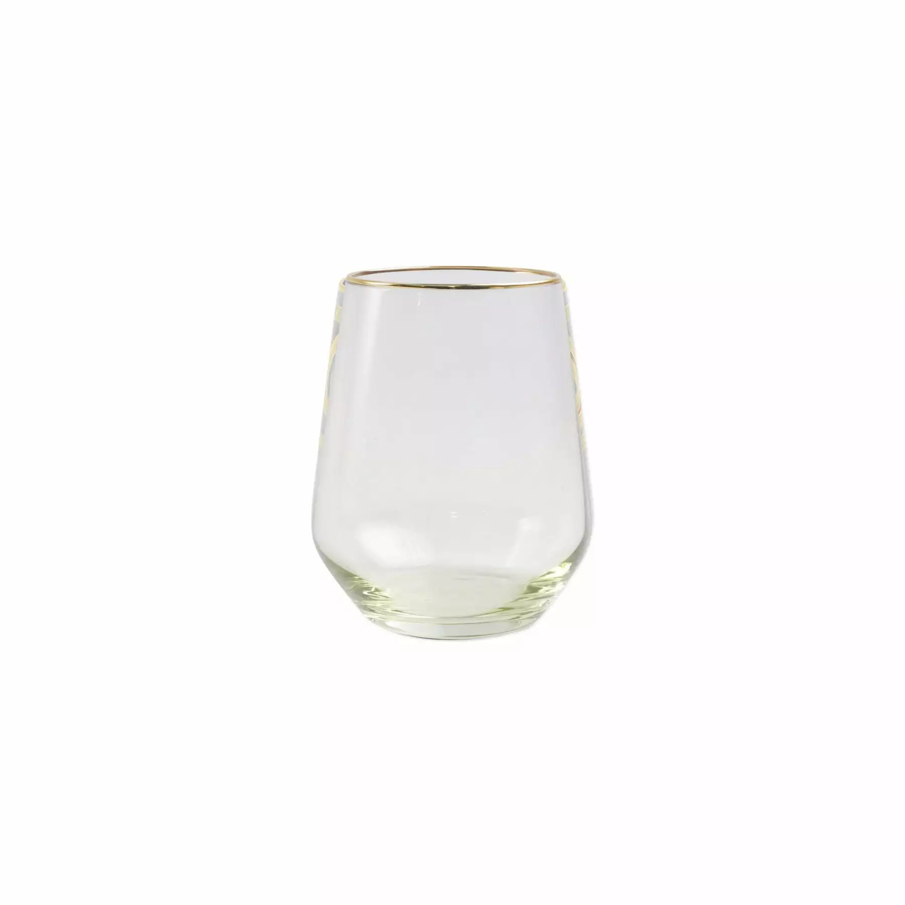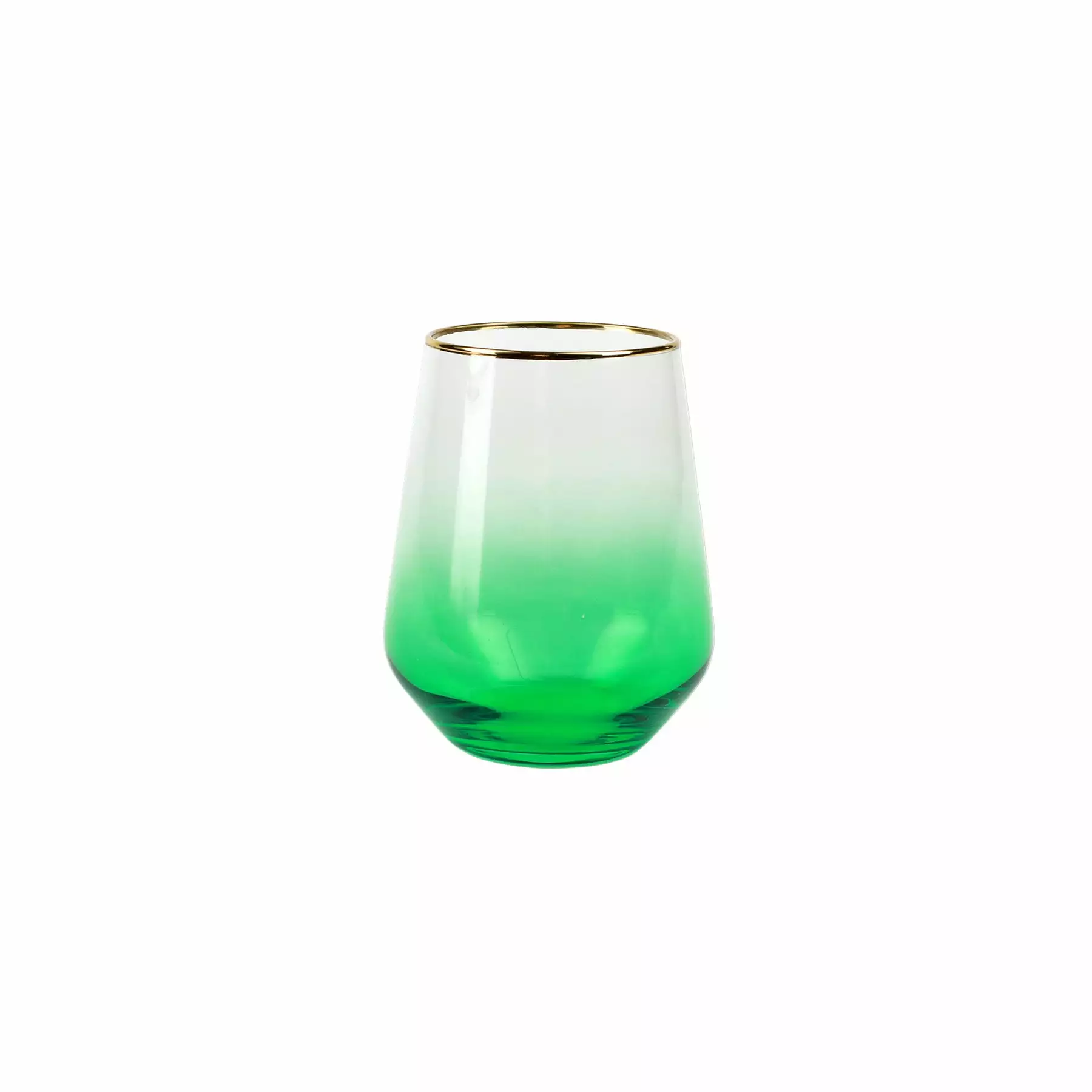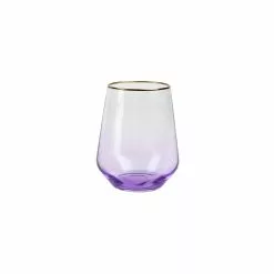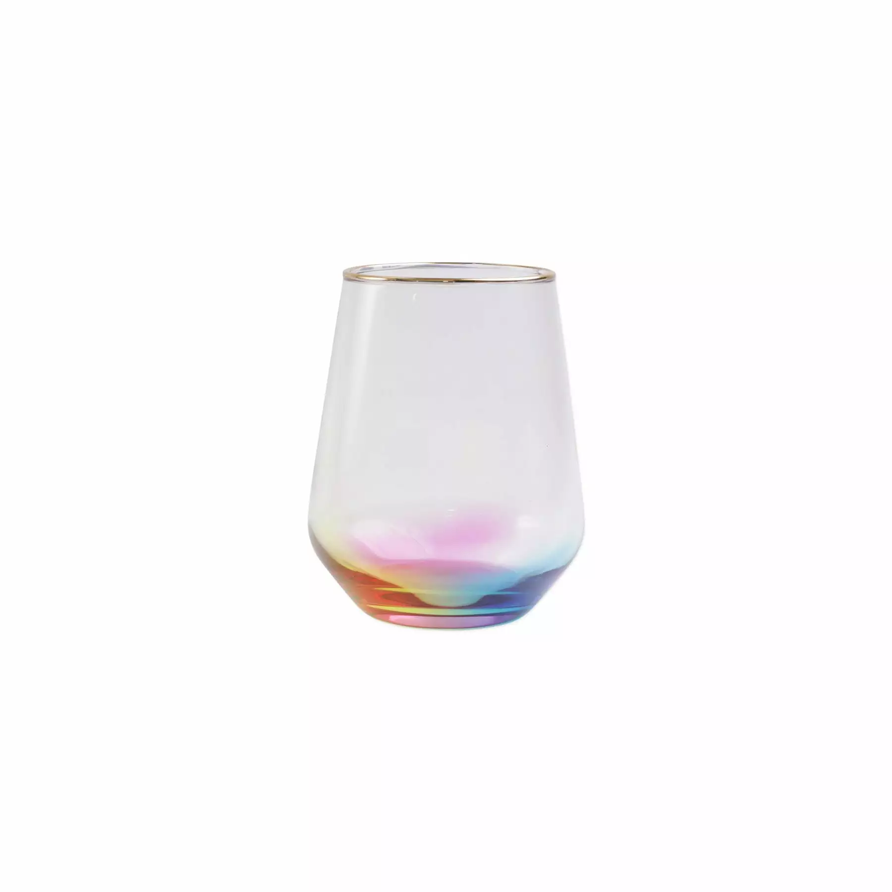 Add sparkle to any setting with a gilded gold rim and varied colored glass that refracts light on the Rainbow Stemless Wine Glass.
